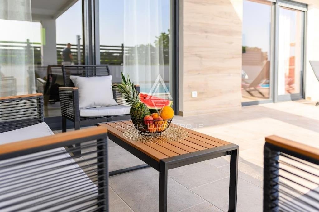Discover this sophisticated villa in the peaceful locale of Juršići, nestled within the verdant landscapes of Svetvinčenat, Istria. Boasting 220 m² of modern living space, this single-story property integrates elegance with functional design, making it an exceptional choice for discerning buyers.
