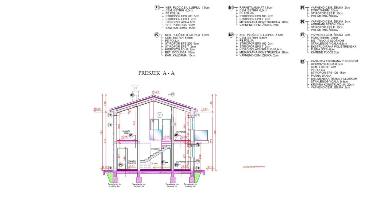 As for heating, there will be a predisposition for underfloor heating with a heat pump, while cooling will be with air conditioning units. The pool area is 26 m2. A fence will be installed between the houses.