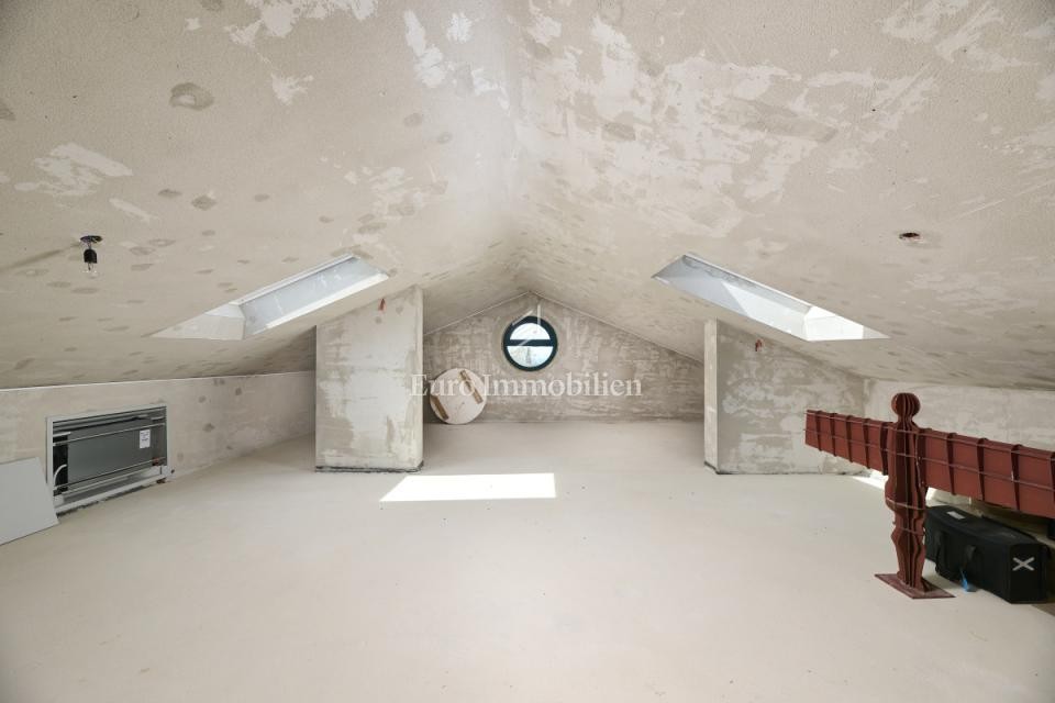 The property includes a basement with a separate entrance (45 m²), a ground floor with an open-plan kitchen, dining and living area leading to a covered terrace, one bedroom with ensuite bathroom, and a separate WC. The first floor offers four bedrooms and two bathrooms, while the attic provides an additional 100 m² of unfinished space with a sea view.
