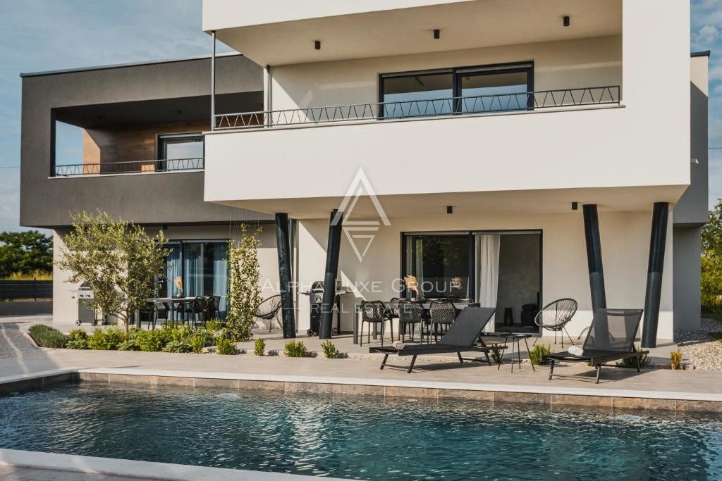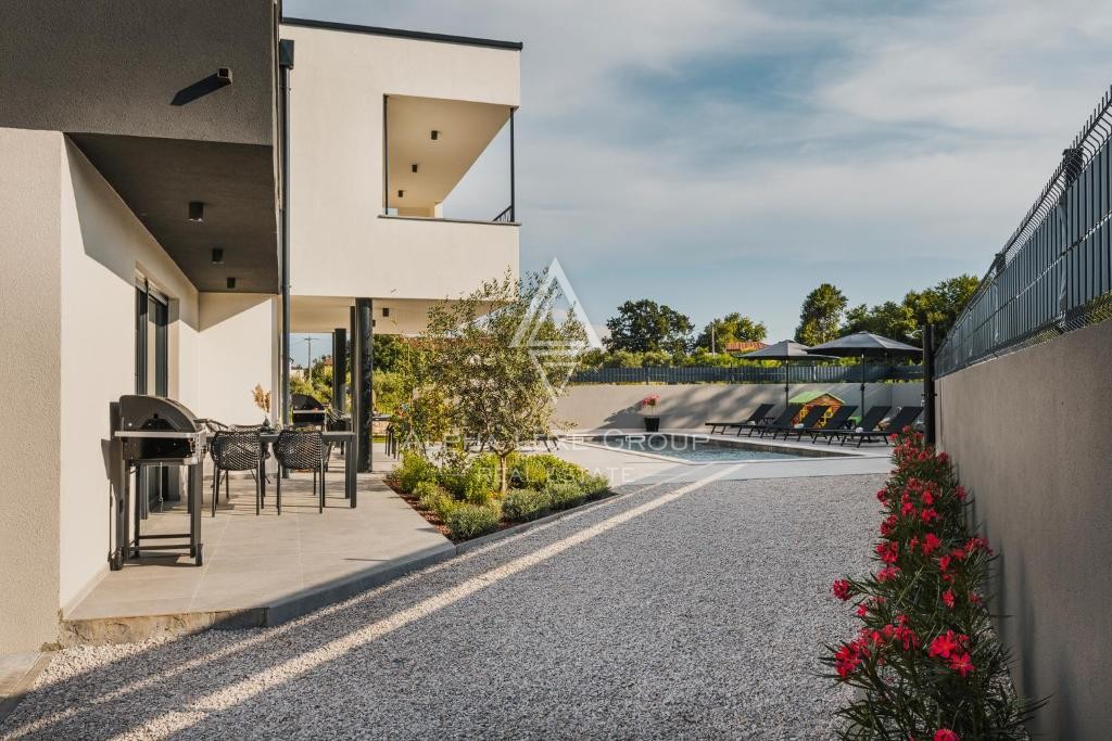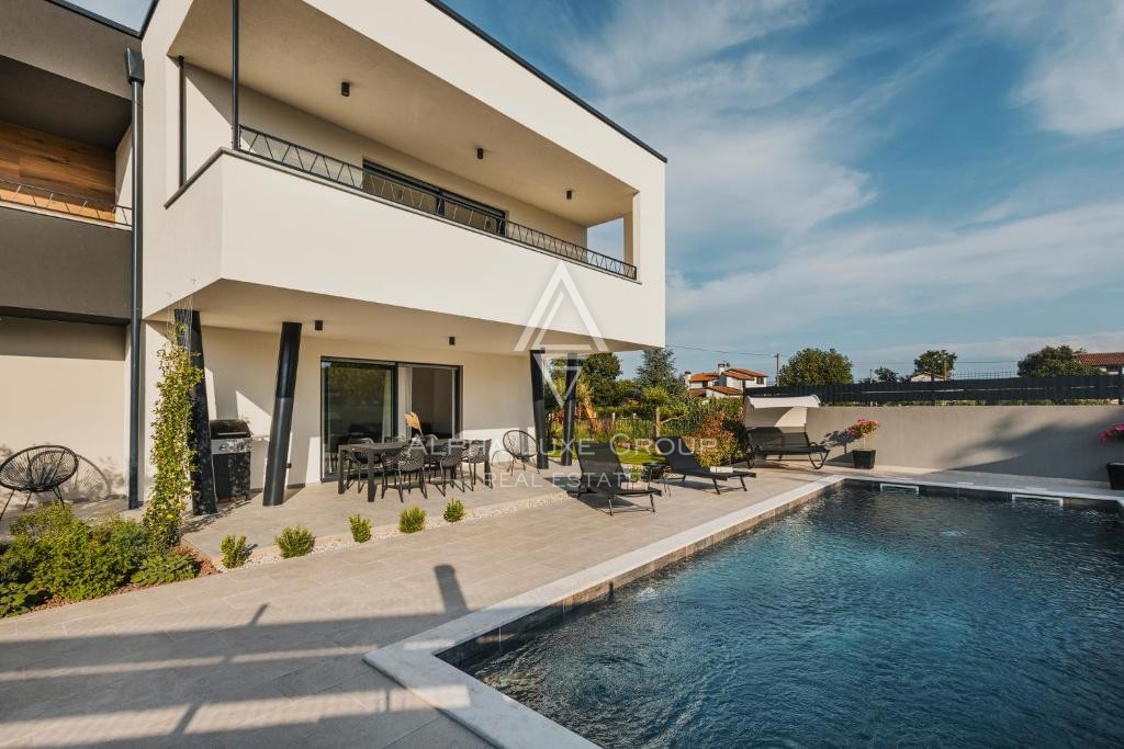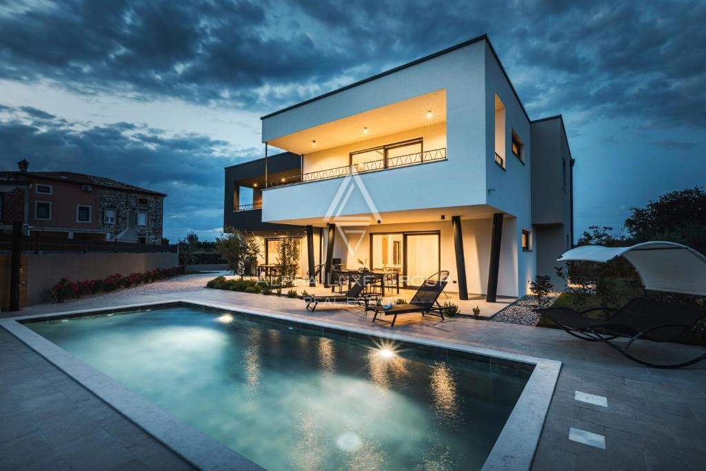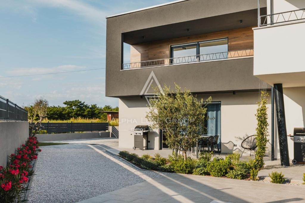Located in a peaceful area near Umag, this modern detached villa offers exceptional comfort and versatility, perfect for living or investment. Set on an 862 m² plot, the villa spans 266 m² across two floors, featuring three separate residential units.