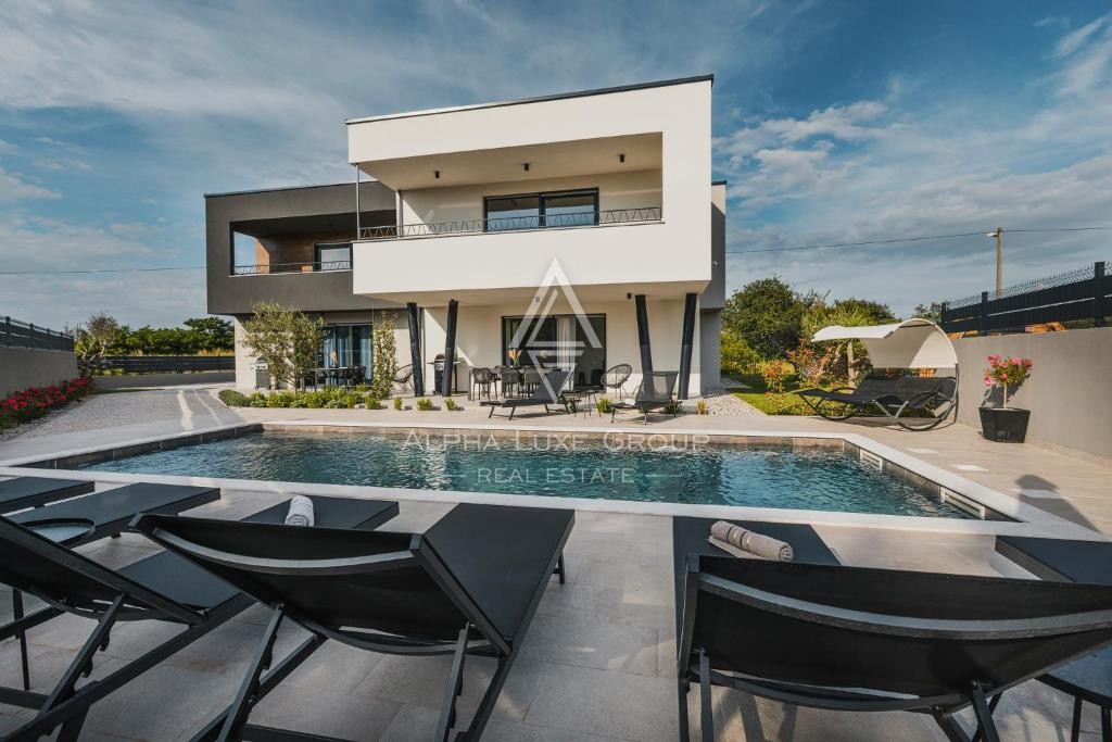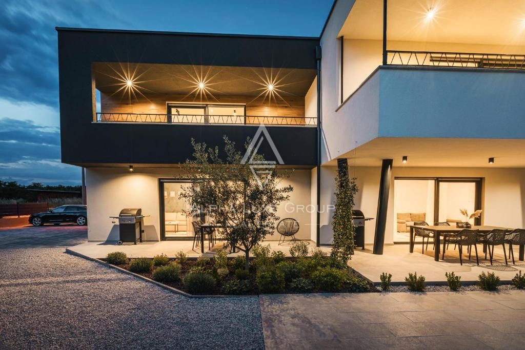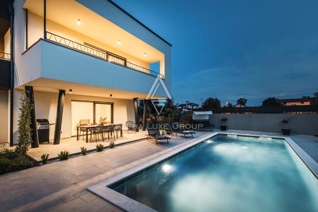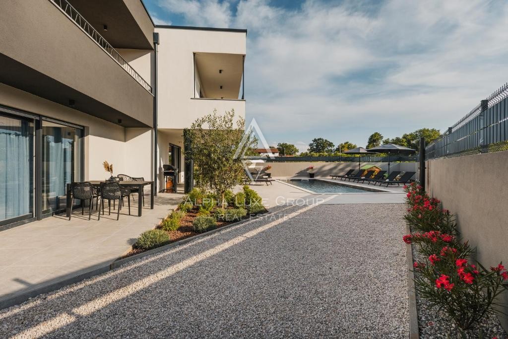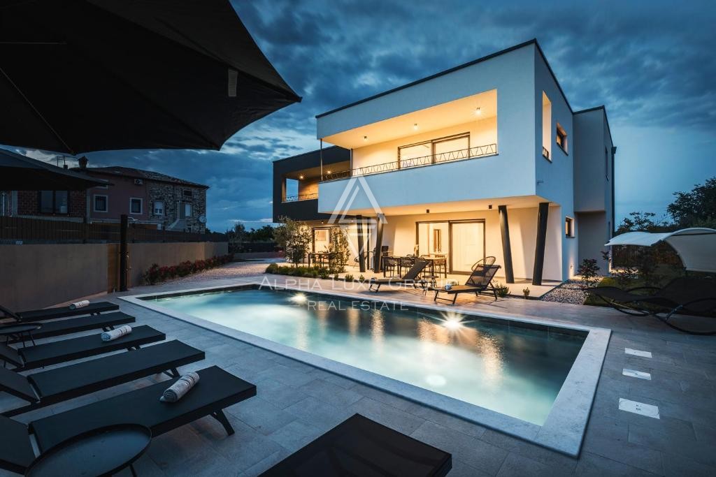 Located in a peaceful area near Umag, this modern detached villa offers exceptional comfort and versatility, perfect for living or investment. Set on an 862 m² plot, the villa spans 266 m² across two floors, featuring three separate residential units.