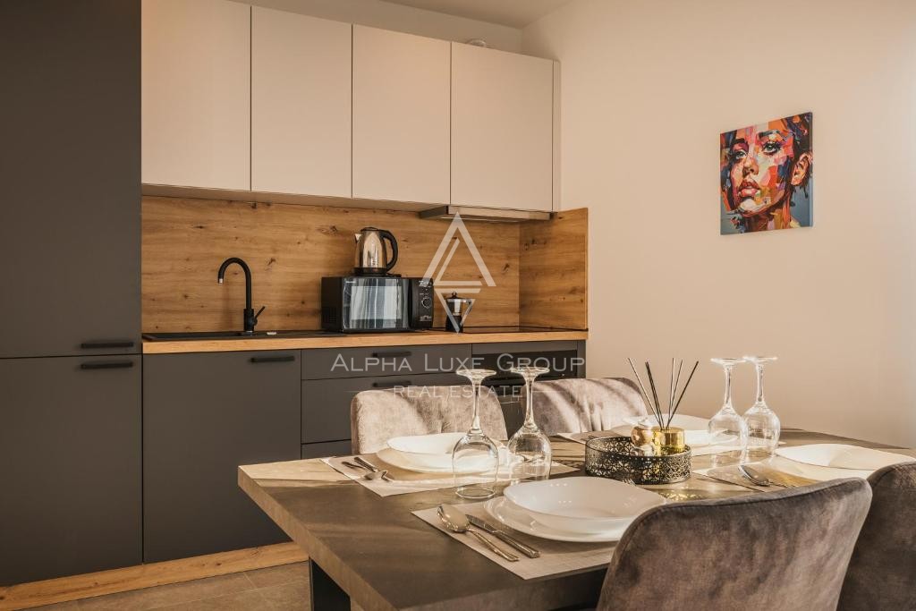 On the ground floor, there are two fully equipped apartments with direct access to a landscaped garden and swimming pool. Each apartment includes an open-plan living room with a kitchen and dining area, a bathroom, one spacious bedroom, and a terrace overlooking the pool. The apartments measure 46 m² and 65 m² and are fitted with electric underfloor heating in the bathrooms and inverter air conditioning.