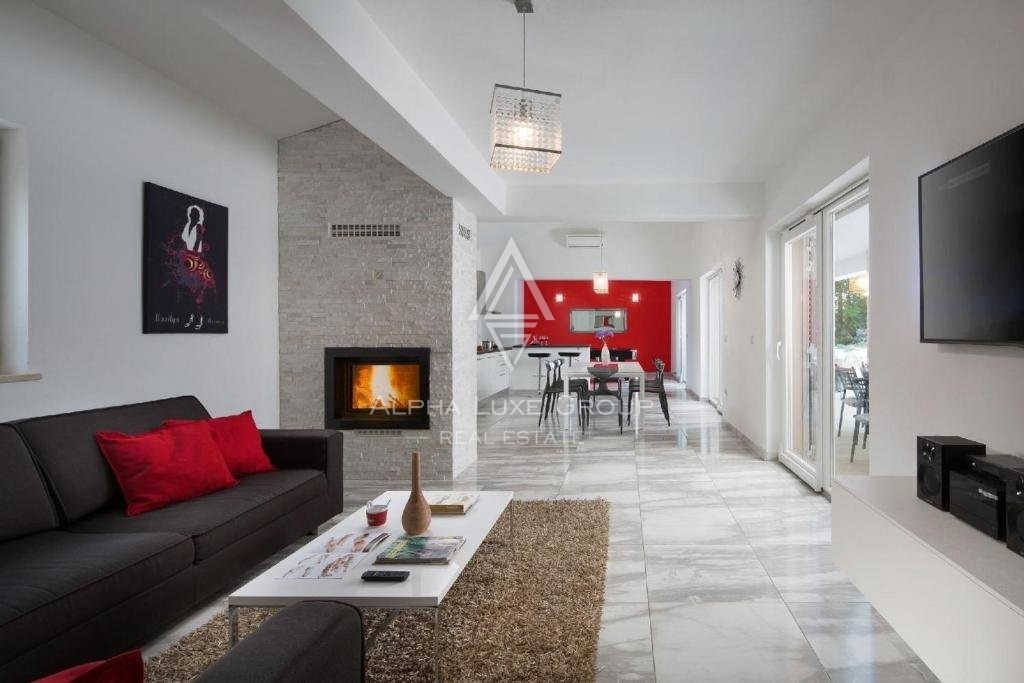 The ground floor is occupied by an ample open space combining a corner with a pool table, living room, dining room, and kitchen with access to a spacious covered terrace. Two bedrooms with ensuite bathrooms, guest toilets, and storage are on the same floor.