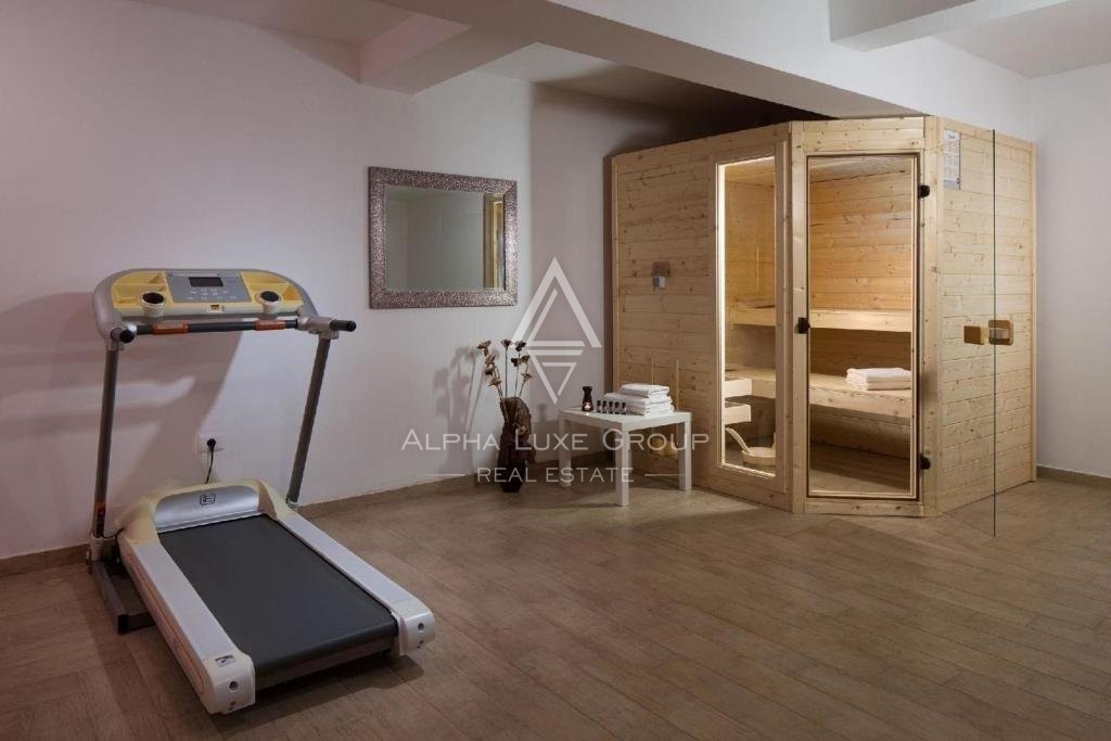 The basement has a spa and wellness area with a jacuzzi, sauna, fitness room, and bathroom.