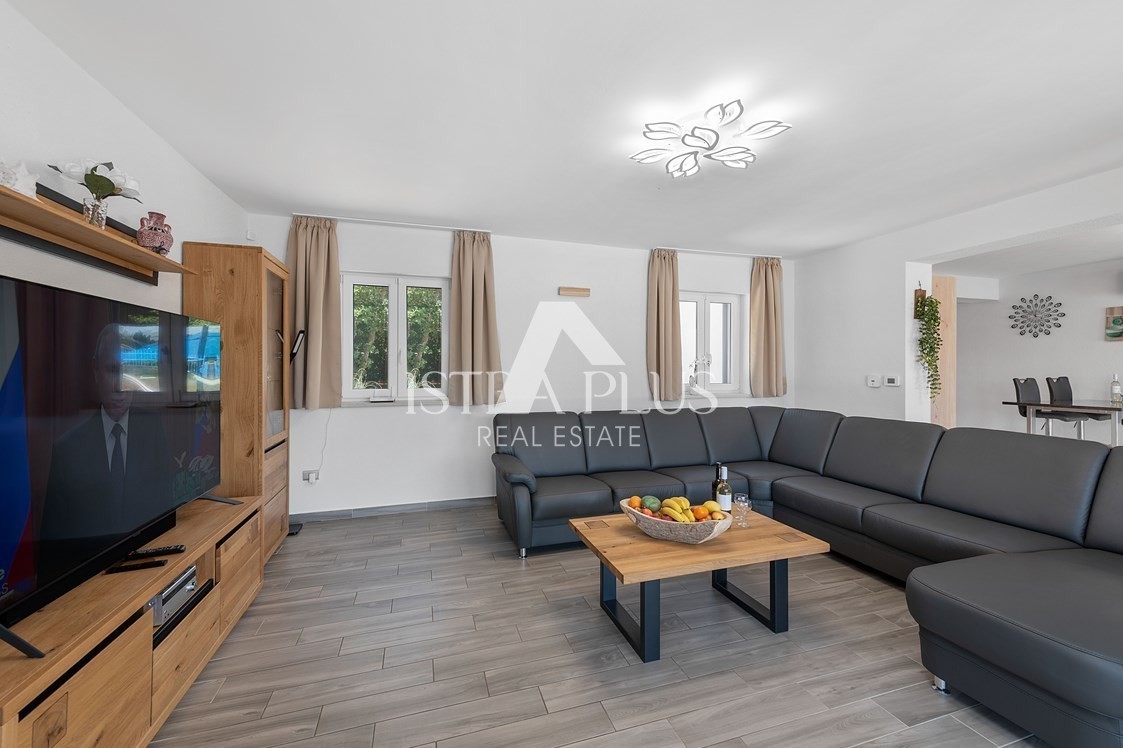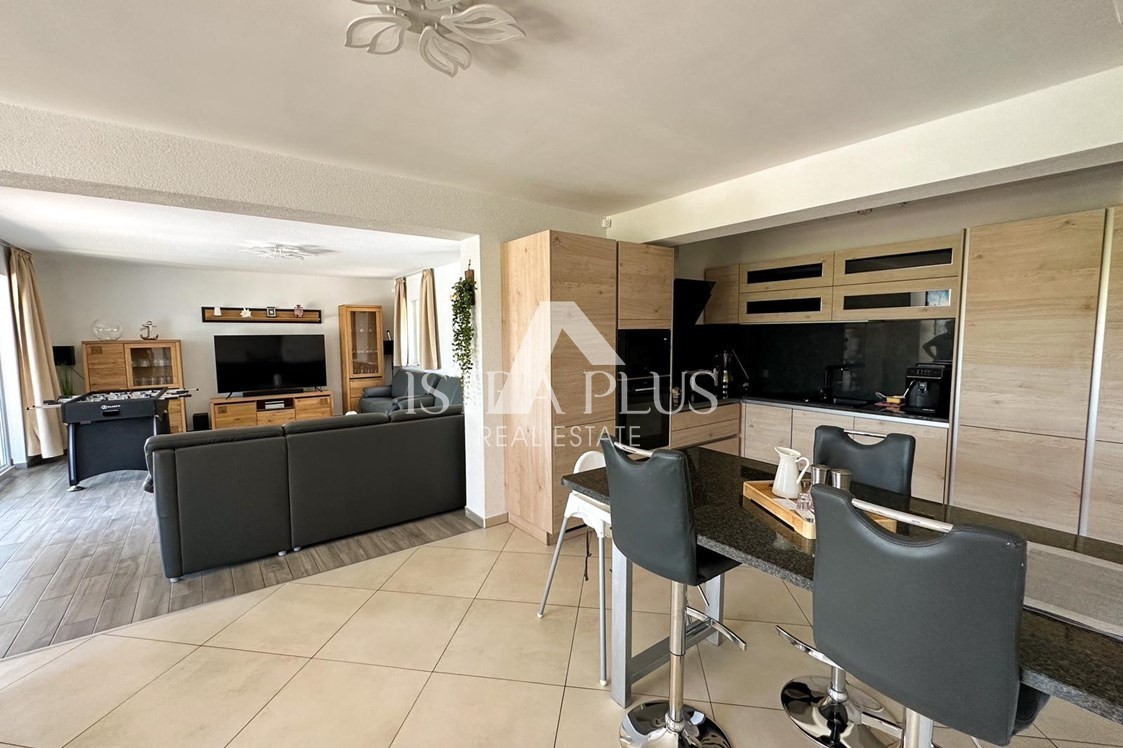 On the ground floor there is a hallway through which you enter the living room and dining room with an open space concept kitchen, through large panoramic doors you can access a covered terrace with a summer kitchen, a fireplace, and below there is a nice sunbathing area with a heated pool.