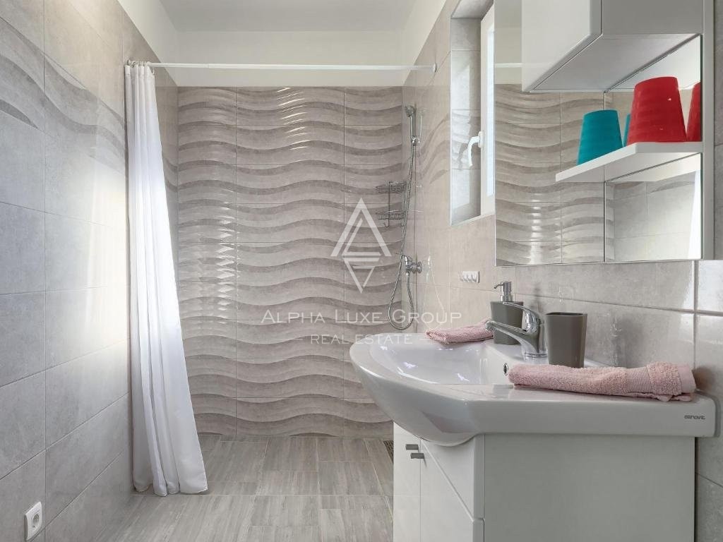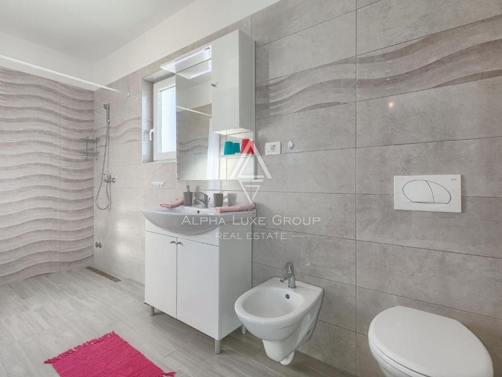 Na prvom katu kuće nalaze se dvije prostrane spavaće sobe i dvije kupaonice, a iz jedne spavaće sobe se direktno izlazi na terasu koja je cijeli dan osunčana.