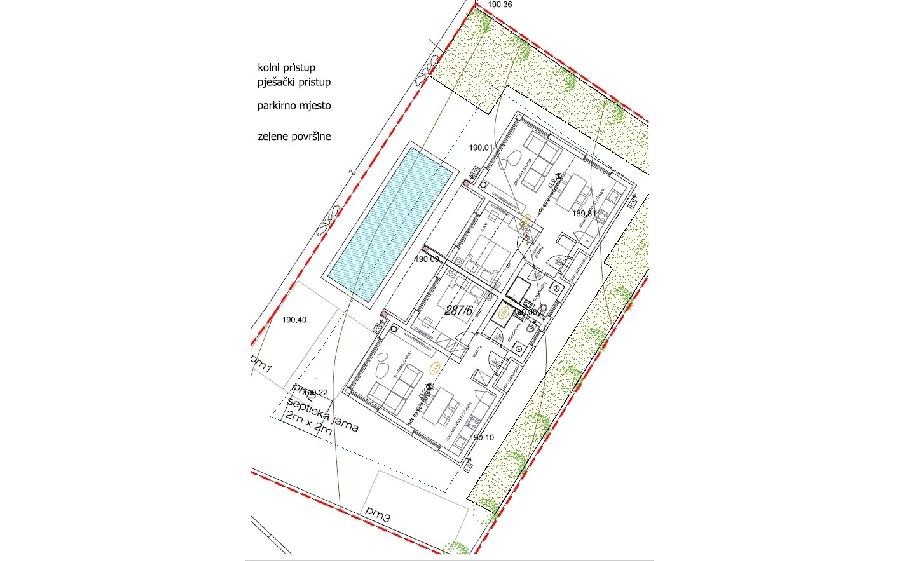 sa dva apartman + trijem, svaki sa zasebnim ulazom ,bazen, 3 parkirna mjesta.