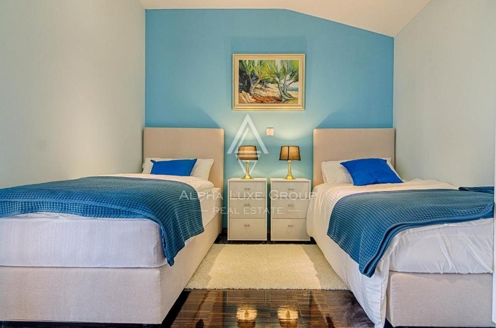 Prostirući se na površini od 226m2, vila se sastoji od podruma, prizemlja i prvog kata. U podrumu se nalazi sauna, tehnička soba i fleksibilni prostor koji se može prilagoditi vašim željama. Prizemlje obuhvaća ulazni hol koji vodi do dnevnog boravka s desne strane i spavaćih soba s lijeve strane, uključujući dvije spavaće sobe svaka s vlastitom kupaonicom, od kojih jedna ima prekrasan pogled na bazen i plažu. Otvoreni kuhinjski i blagovaonski prostor se spaja s prostranim dnevnim boravkom, nudeći izravan pristup bazenu i zadivljujući pogled na okolinu. Dodatno, kuhinja i blagovaonica imaju izlaz na natkrivenu terasu s pogledom na prostrani vrt. Na prvom katu nalazi se praonica rublja i dvije spavaće sobe, svaka s privatnom kupaonicom, od kojih jedna soba ima vlastitu natkrivenu terasu s pogledom na bazen.