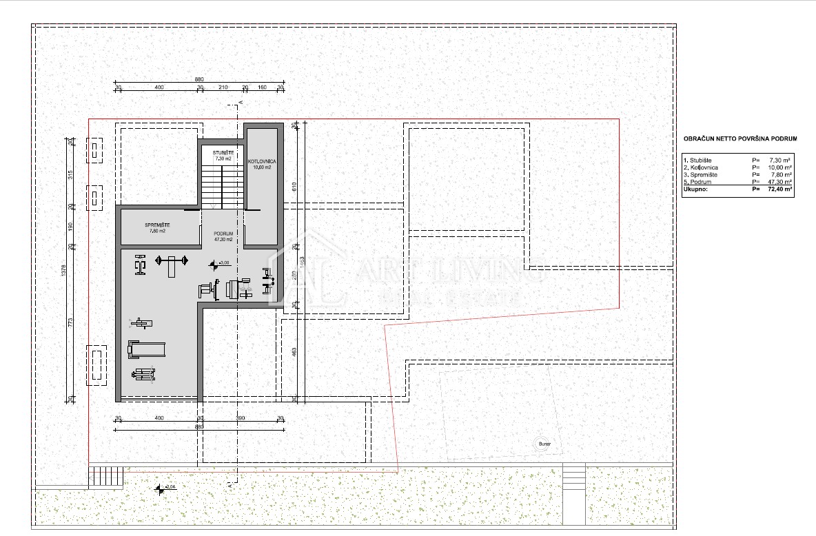 Podrum ukupne netto površine 72,40 m2 sastoji se od prostorije za teretanu te spremišta i kotlovnice.