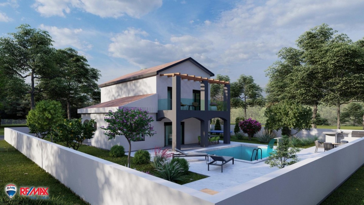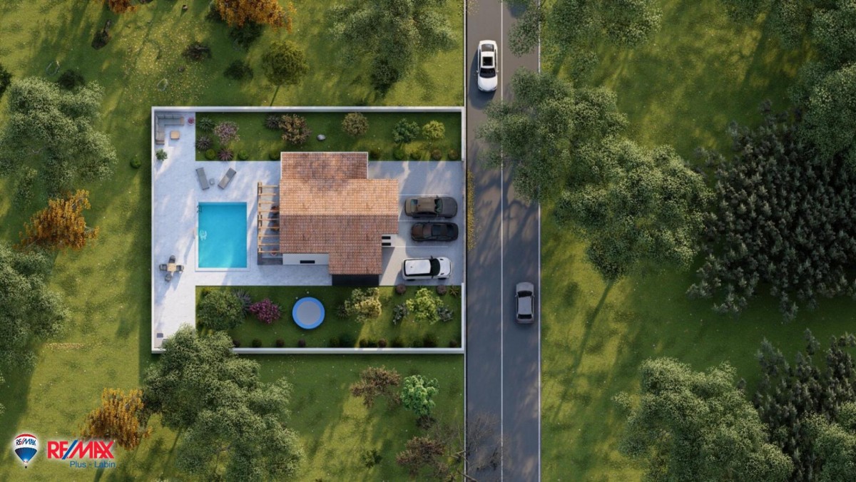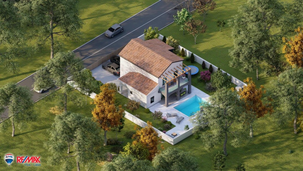 U blizini grada Labina, nudi se na prodaju građevinska parcela površine 550 m2 sa izrađenim projektom za obiteljsku kuću sa bazenom.