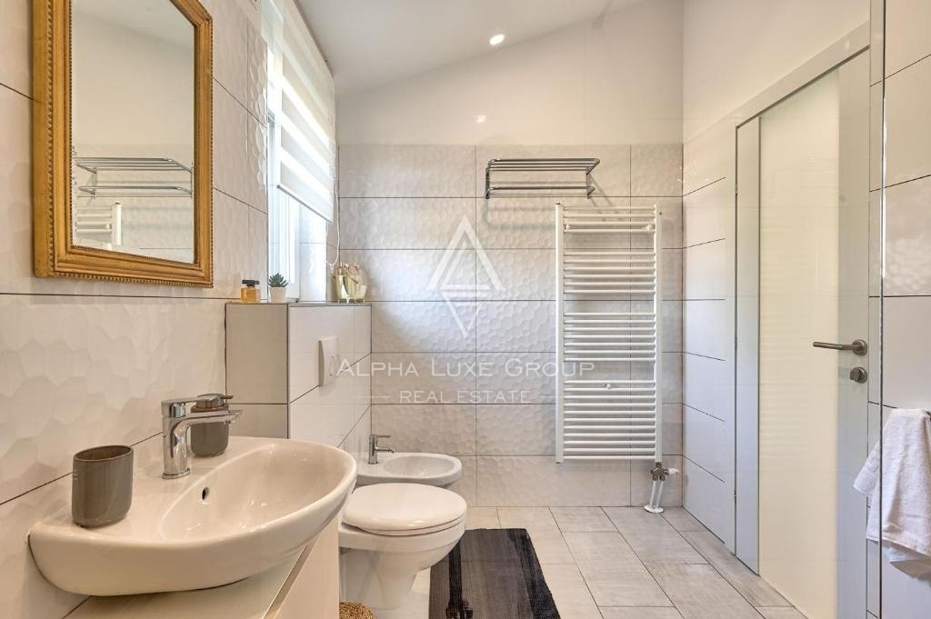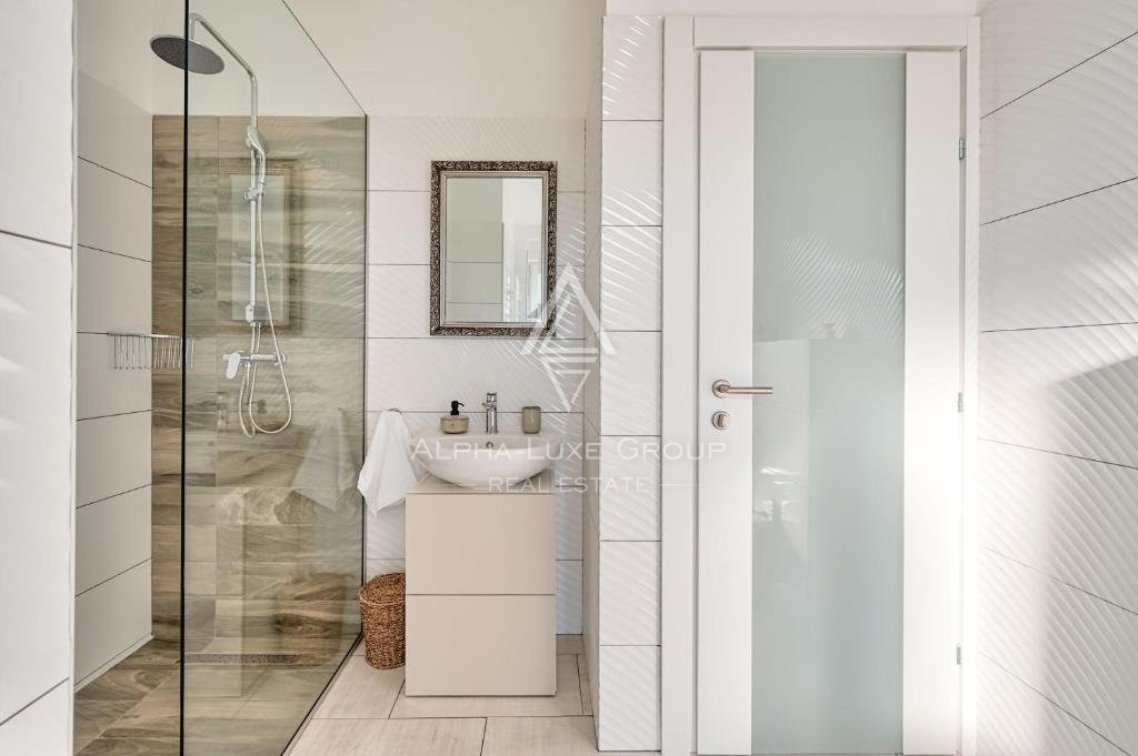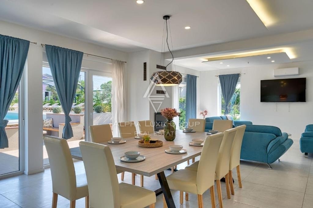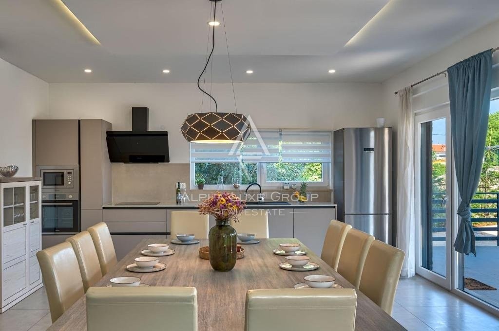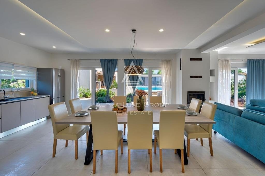 Ova sjajna kuća s dva kata ponosi se modernim dizajnom s besprijekornim protokom između životnih prostora. Prizemlje otkriva prostranu otvorenu površinu koja obuhvaća kuhinju, blagovaonicu i dnevni boravak, proširenu do spavaće sobe s vlastitom kupaonicom i pristupom natkrivenoj terasi, uz gostinjski WC. Uza stepenice na prvom katu nalaze se tri dodatne spavaće sobe, svaka s privatnom kupaonicom i pristupom terasama s pogledom na miran krajolik i bujno zelenilo. Vanjski prostor sadrži očaravajući preljevni bazen, sunčalište za opuštene dane pod suncem, potpuno opremljenu pomoćnu zgradu za produžene boravke i ljetnu kuhinju, što olakšava vanjsku zabavu. Ulazni portun i natkriveni parking za dva vozila dodaju praktičnost i eleganciju ovoj rezidenciji.