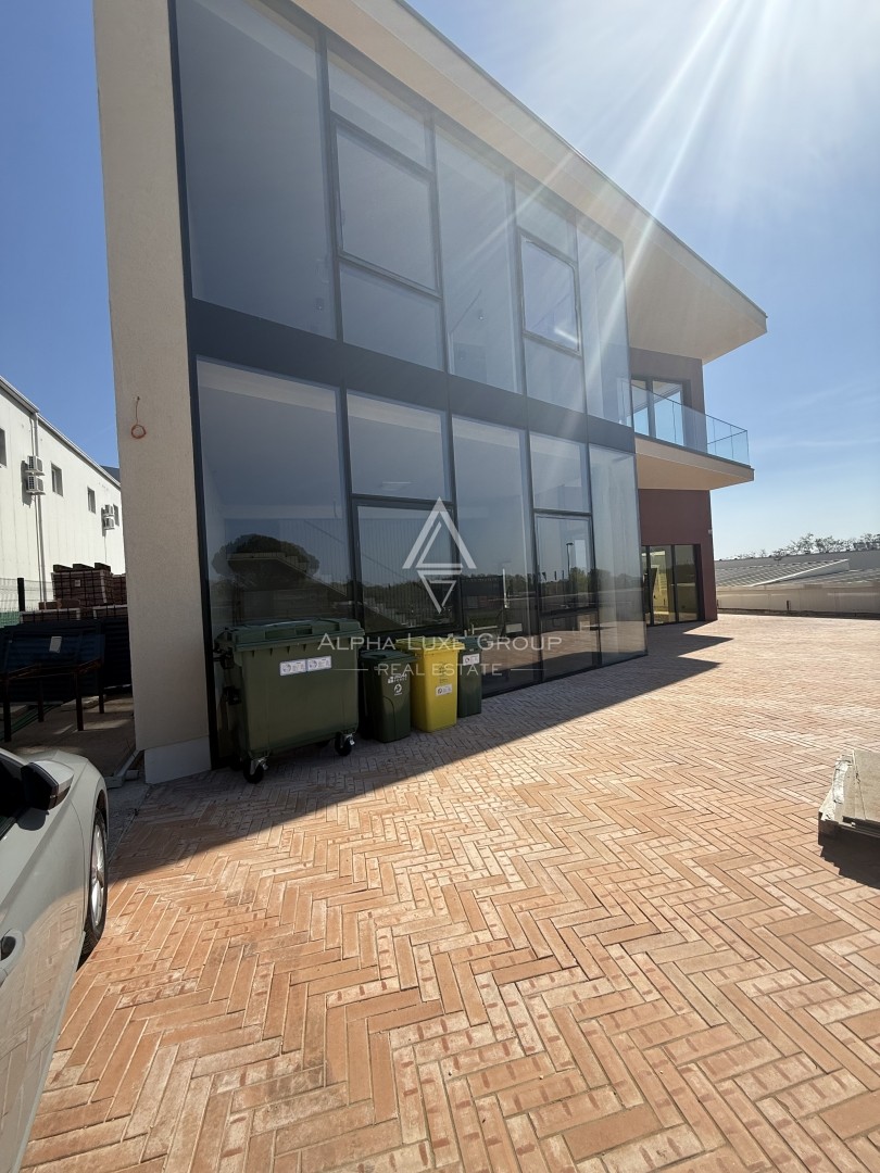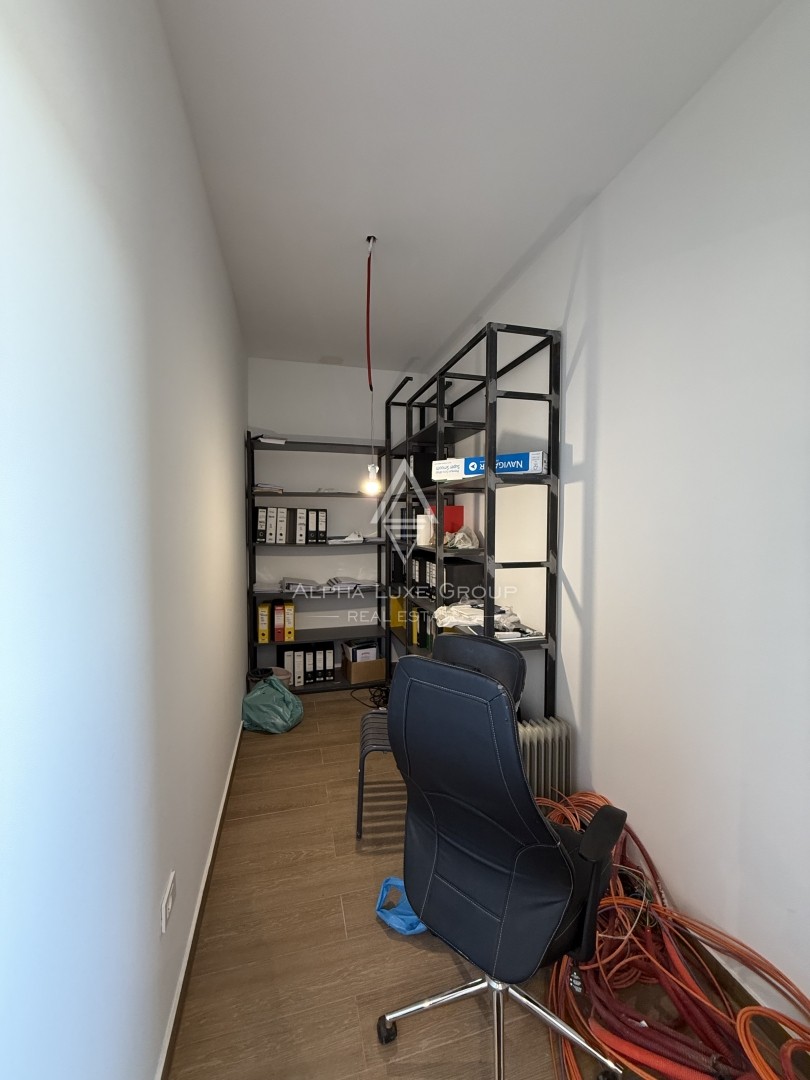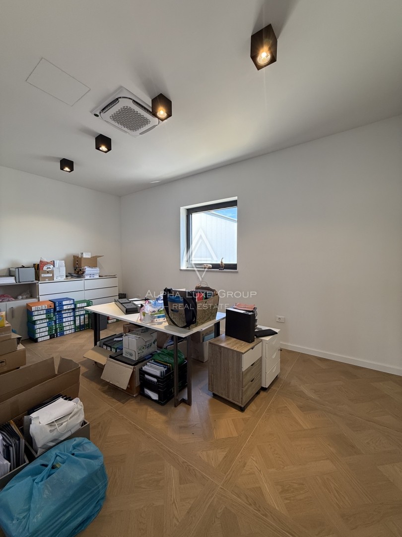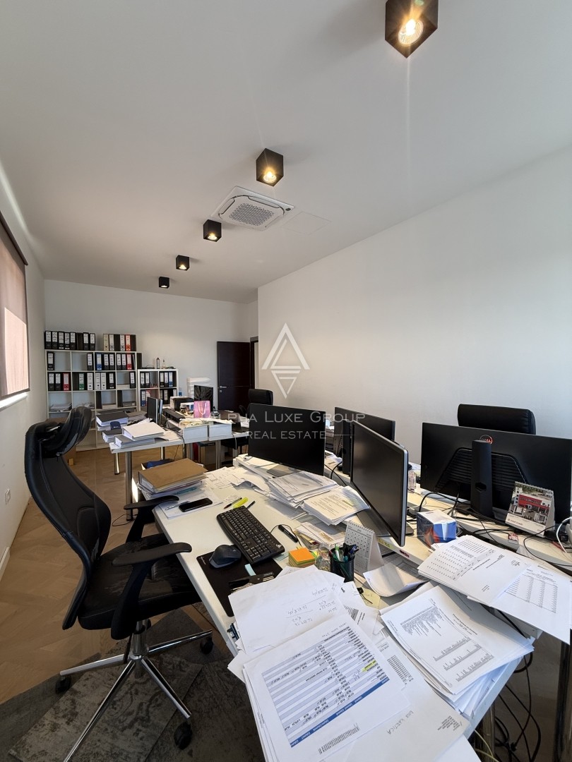 Prvi kat, površine 244,71 m², potpuno je opremljen i trenutno organiziran kao funkcionalan uredski prostor. Sastoji se od recepcije, sale za sastanke, četiri ureda, potpuno opremljene kuhinje te tri kupaonice, od kojih jedna ima tuš. Dodatno, natkrivena terasa pruža dodatnu udobnost te služi kao idealan prostor za neformalne sastanke ili opuštanje zaposlenika. Ova etaža omogućuje nesmetano poslovanje bez dodatnih ulaganja.