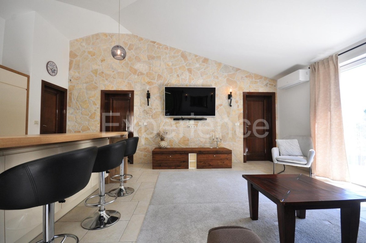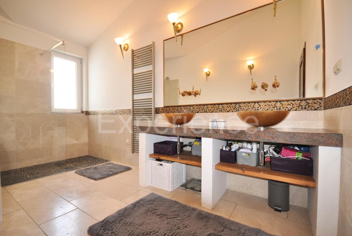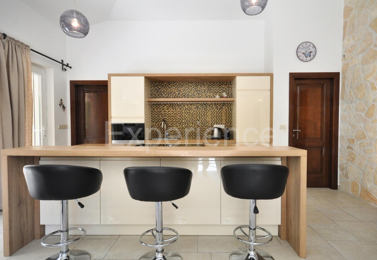 U zelenilu mirnog naselja, svega nekoliko minuta vožnje od Poreča i kristalno čistih plaža, nalazi se ova izuzetno očuvana samostojeća kuća s bazenom i uređenim vrtom, idealna za obiteljski život, odmor ili investiciju. Kuća se prostire na zemljištu od 600 m², ukupne površine 180 m², pažljivo podijeljena na dva potpuno odvojena stambena prostora, svaki sa svojim zasebnim ulazom, privatnošću i funkcionalnošću. Prvi stan raspoređen na dvije etaže: • Prizemlje: dnevni boravak s izlazom na terasu, kuhinja, spavaća soba i kupaonica s ostavom, • Kat: dvije prozračne spavaće sobe i dodatna kupaonica.Ovaj stan je idealan za veću obitelj ili za rad od kuće u mirnom okruženju. Drugi stan uključuje: • prostrani open-space dnevni prostor povezuje kuhinju, blagovaonicu i dnevni boravak s direktnim izlazom na natkrivenu terasu i privatni dvorišni dio sa grijanim bazenom i sunčalištem, • dvije spavaće sobe, • kupaonicu i dodatni toalet.Savršen za goste ili članove obitelji, potpuno odvojen i funkcionalan stan. Dodatne značajke: • kuća je izgrađena 2013. godine, odmah useljiva bez dodatnih ulaganja, • klima uređaji za grijanje i hlađenje, • podno grijanje u kupaonicama, • PVC stolarija s komarnicima i tradicionalnim drvenim griljama (škure), • uređeno dvorište s travnjakom, mirisnim biljem, natkrivenom ljetnom kuhinjom i roštiljem, • natkriveni parking za dva automobile i spremište, • svaki stan ima zaseban ulaz, što dodatno osigurava privatnost, • priključak na kanalizaciju, brzi internet i SAT TV. Lokacija: 4 km od centra Poreča, 3 km od plaže – savršen balans mira i dostupnosti svih sadržaja. Kuća se prodaje bez namještaja, uz mogućnost dogovora s vlasnicima.