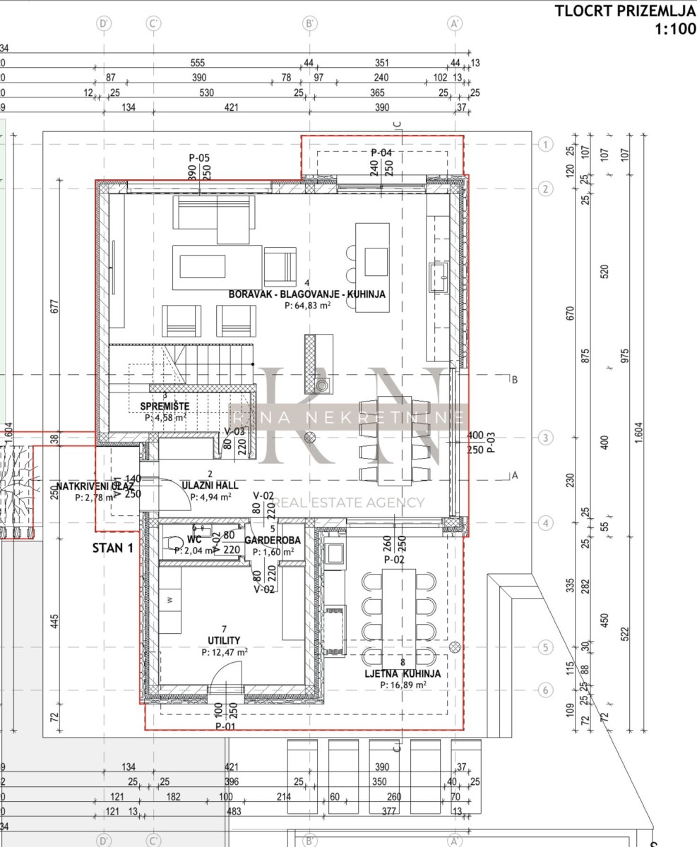Ulaznog prostora sa prostorom za ugradbene ormare, odvojenog gostinjskog wc-a, utility rooma idealnu za odvojeni vešeraj i tehničku sobu, na istoj etaži nalazi se prostrani open space dnevni boravak sa kuhinjom od 64,83m2 (bogata dnevna svjetlost zbog velike stolarije od poda do stropa).
