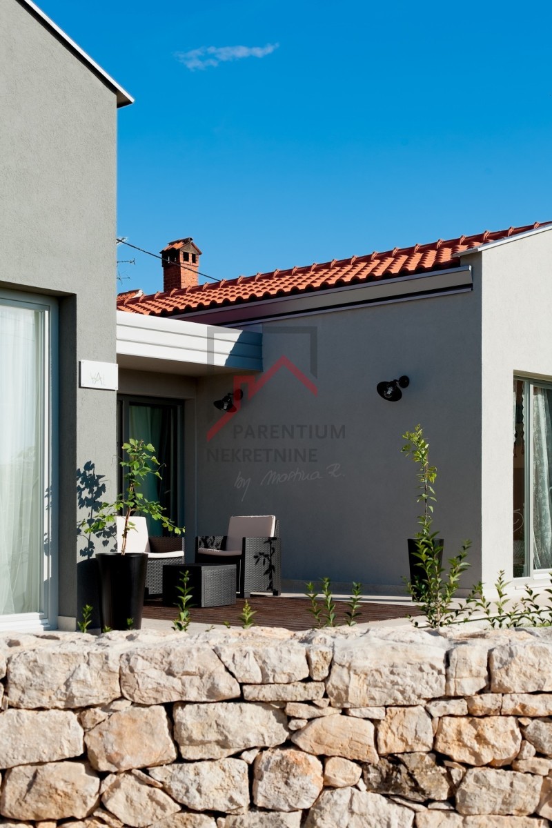 Dvorište je u potpunosti ograđeno i uređeno kako bi se osigurala maksimalna privatnost. Uz bazen sa sunčalištem, u stražnjem dijelu dvorišta nalazi se natkrivena ljetna kuhinja s roštiljem, idealna za tople večeri i druženja s obitelji i prijateljima.