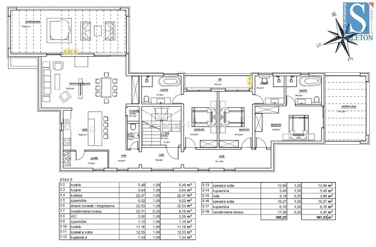 Poreč, u mirnom gradskom naselju prodaje se novi stan površine 161,54 m², sastoji se od dnevnog boravka, velike terase površine 32 m² s koje se pruža pogled na more, kuhinje, blagovaonice, 2 dodatne terase, hodnika, 3 spavaće sobe - svaka sa svojom kupaonicom i izlazom na terasu, ostave i WC-a. Stan se nalazi na drugom katu zgrade sa ukupno 5 stambenih jedinica, orijentiran je prema jugu što garantira puno prirodnog svijetla. Stan ima 4 klime marke Mitsubishi Electric ( u dnevnom boravku i u spavaćim sobama ), podno grijanje u cijelom stanu ( dizalica topline ), priprema tople sanitarne vode je također putem dizalice topline sa spremnikom od 175 litara, ima i protuprovalna ulazna vrata, PVC prozore s tri stakla, komarnicima i električnim roletama, pripadaju mu i dva parkirna mjesta ispred zgrade. Stan se nalazi u slijepoj ulici s malo prometa, udaljen je 500 m od stanice javnog gradskog prijevoza, te 1,5 km od mora/plaže i 3 km od centra Poreča.