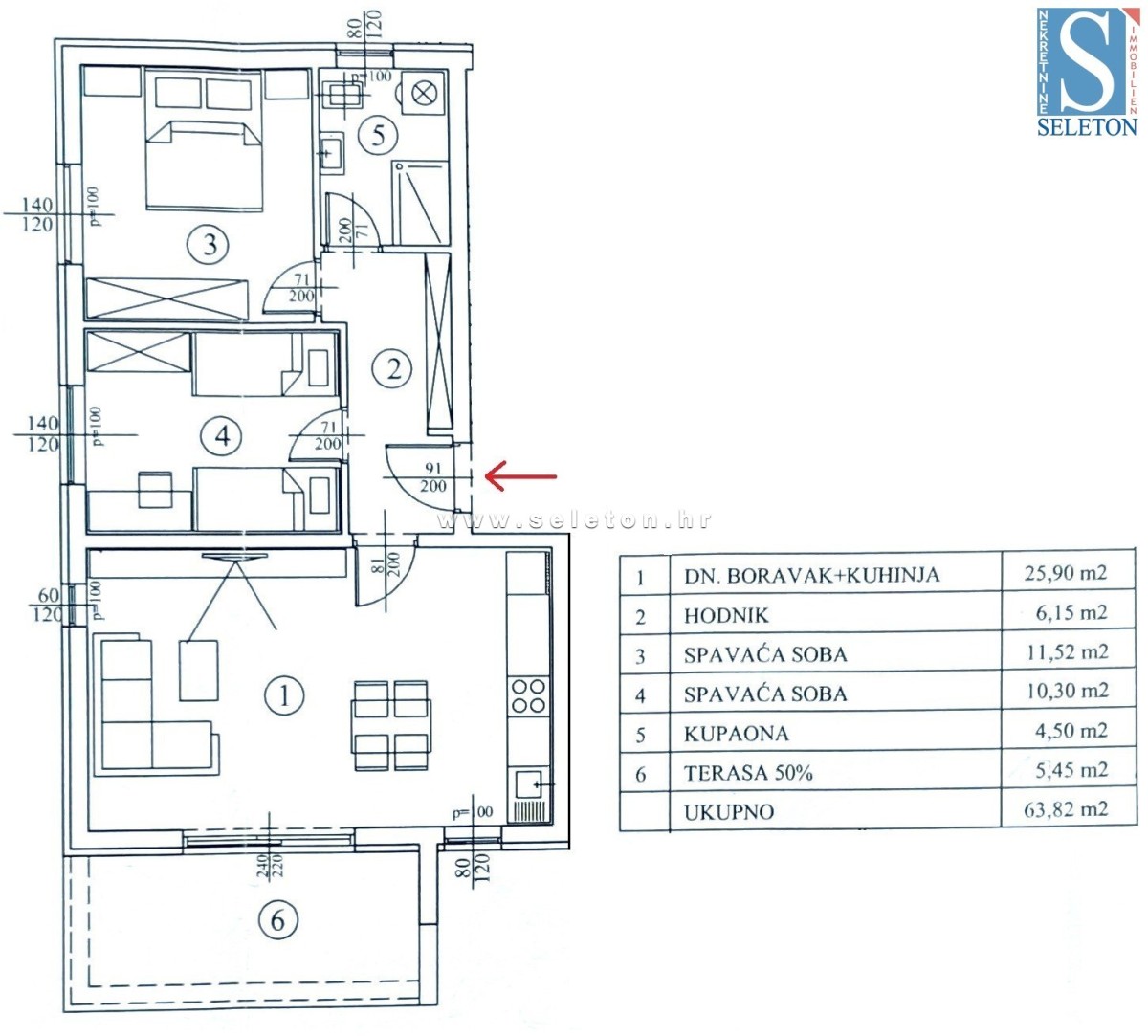 U novoj modernoj zgradi prodaje se stan na prvom katu zgrade, stan ima površinu od 64 m², sastoji se od dnevnog boravka, kuhinje, natkrivene terase, hodnika, 2 spavaće sobe i kupatila. Stan je orijentiran prema jugu što garantira puno prirodnog svijetla, ima klima uređaj, protuprovalna ulazna vrata, podno grijanje u dnevnom boravku i kupaonici, pripadaju mu dva parkirna mjesta ispred zgrade. Stan je udaljen ca 9 km od Poreča i oko 10 km od mora.