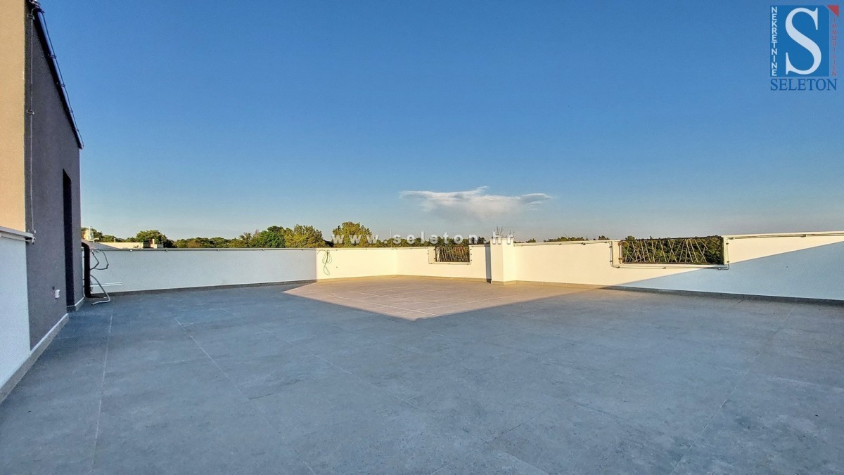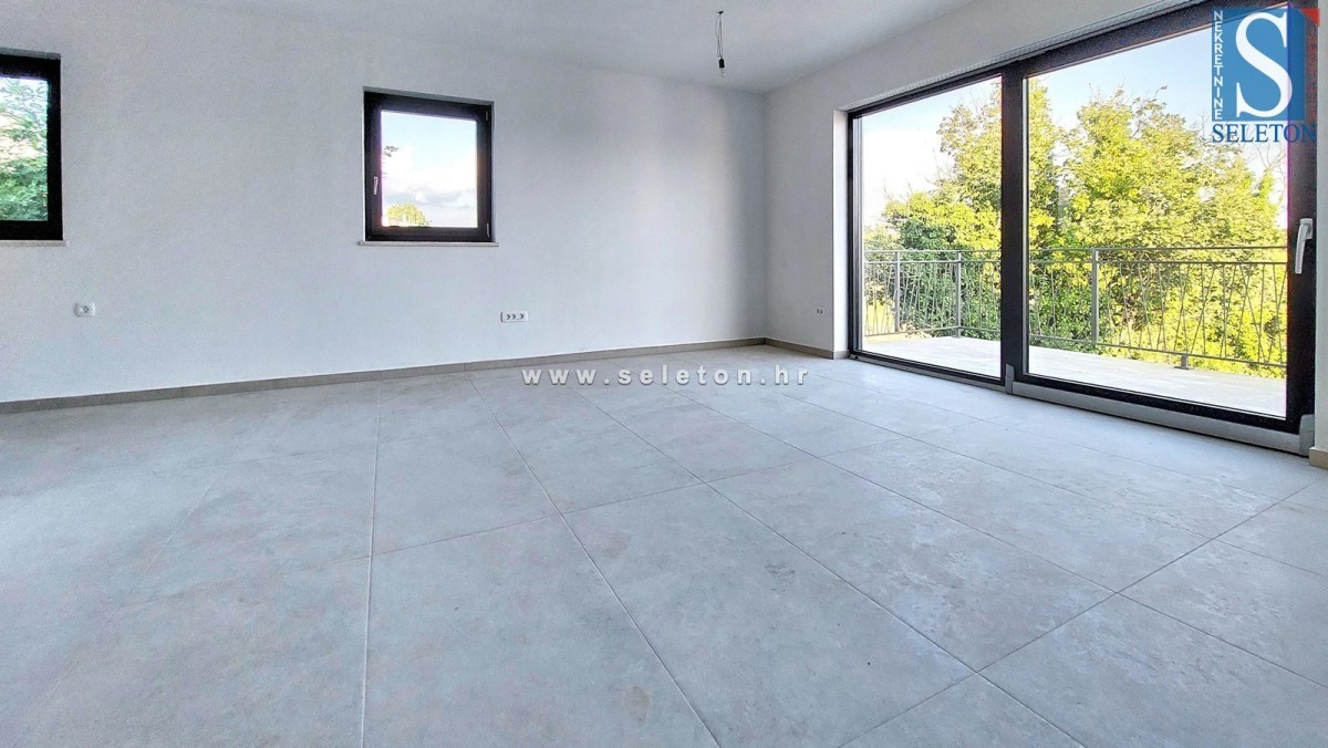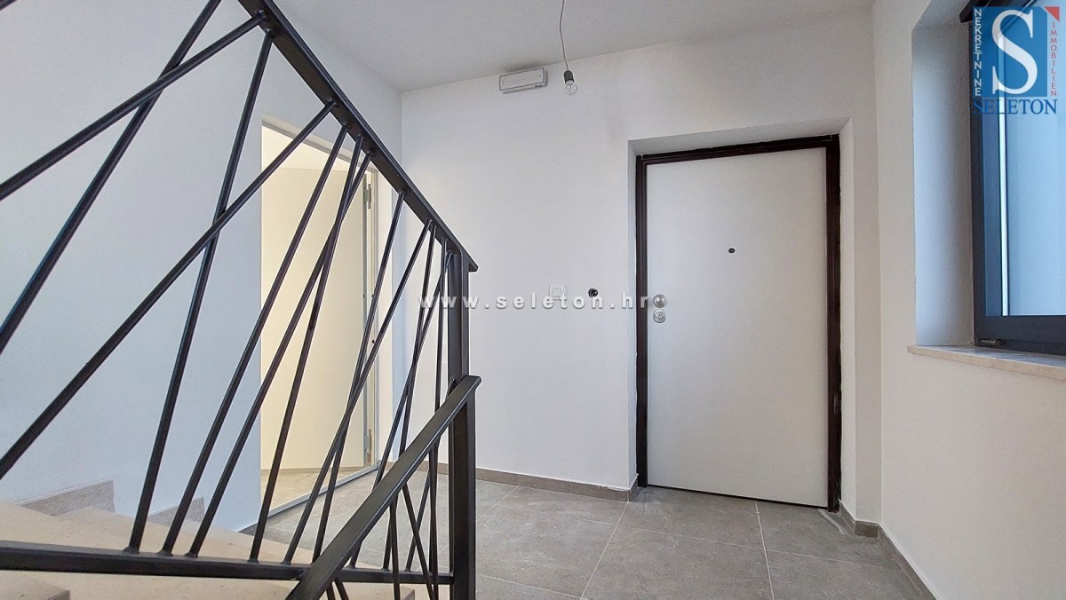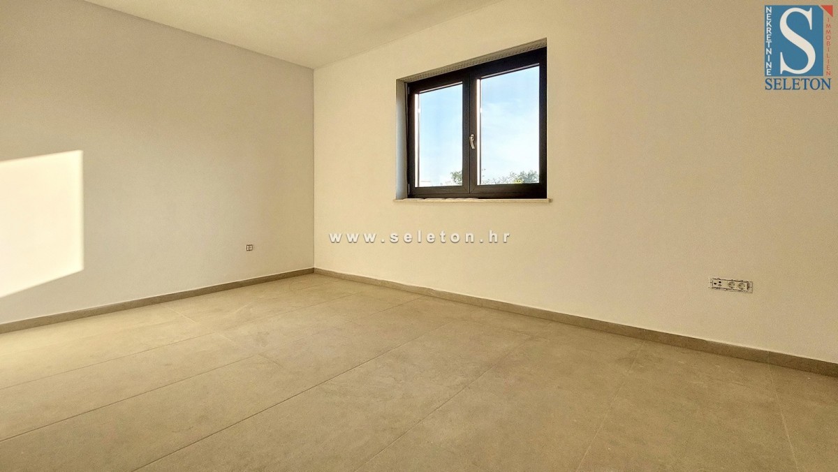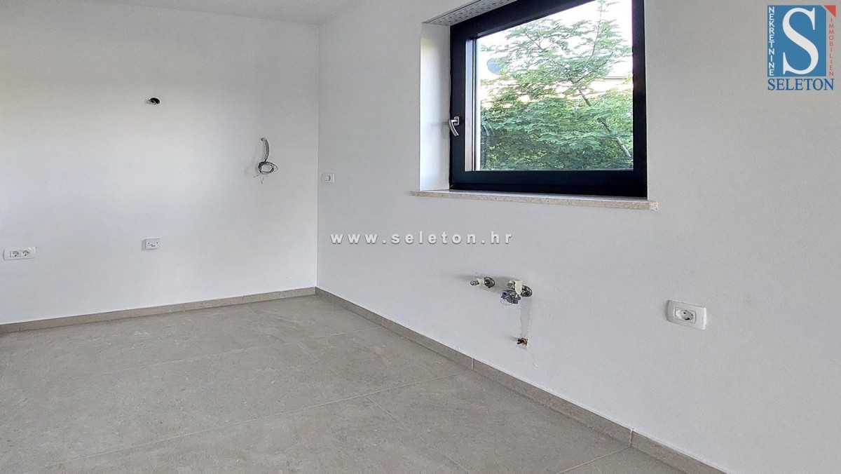 U modernoj zgradi sa samo 4 stambene jedinice prodaje se stan na prvom katu zgrade, stan ima površinu od 85 m², sastoji se od dnevnog boravka, kuhinje, terase, hodnika, 3 spavaće sobe, kupatila, WC-a i dva spremišta. Stan ima klima uređaj, protuprovalna vrata, podno grijanje u dnevnom boravku, kupaonici i WC-u, pripada mu krovna terasa površine 84 m² i dva parkirna mjesta ispred zgrade. Stan je udaljen ca 9 km od Poreča, oko 1,5 km od mora, u naselju se nalaze restorani, kafići, ljekarna, crkva i škola, do supermarketa ima ca 1 km.
