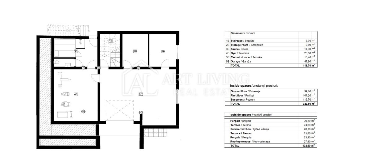 U podrumu se smjestila wellness oaza sa saunom i teretanom, spremište, tehnička soba i garaža. Podrum je ukupne površine 116,70 m2.