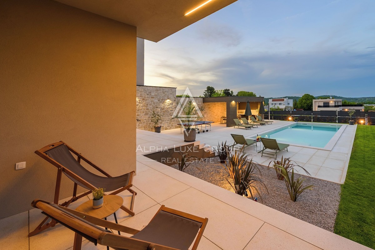 U eksterijeru se nalazi bazen od 48 m² s tehnologijom slane elektrolize, vanjski tuš te natkrivena ljetna kuhinja od 26 m², idealna za druženja i pripremu obroka na otvorenom. Vrt je dodatno oplemenjen travnjakom s automatskim navodnjavanjem, a na ulazu se nalaze dva natkrivena parkirna mjesta. Sigurnost je osigurana protuprovalnim sustavima na vratima i prozorima, videonadzorom, alarmom i sustavom detekcije požara. Vila je pripremljena za ugradnju solarnih panela te punionice za električna vozila, što je čini energetski naprednom i modernom nekretninom. Prodaje se potpuno namještena i spremna za useljenje.