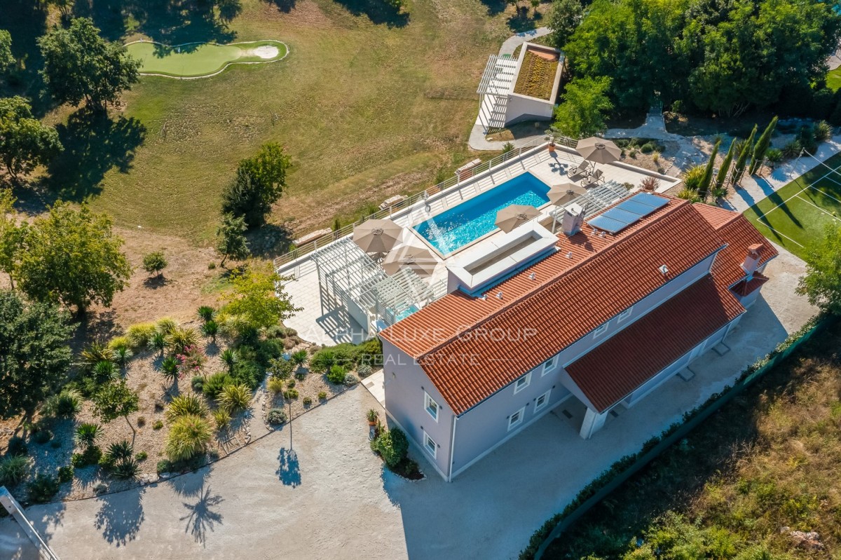 Smještena na prostranoj parceli od 1.850 m² u blizini Svetvinčenta, ova elegantna vila pruža luksuzan spoj udobnosti, privatnosti i modernog mediteranskog života. Prostire se na 254 m² kroz dvije etaže, a raspored je promišljeno osmišljen kako bi pružio mnogo prostora za opuštanje i udoban boravak. Prizemlje se otvara privlačnim ulaznim hodnikom koji vodi u vinski podrum, spremište, praonicu, suvremenu kuhinju i blagovaonicu povezanu s otvorenim dnevnim boravkom. Iz dnevnog boravka vodi izlaz na natkrivenu terasu opremljenu kamenim roštiljem i velikim granitnim stolom za dvanaest osoba—savršeno za objedovanje na otvorenom i druženja.