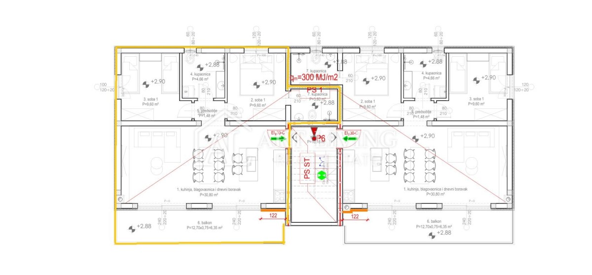 Zgrada se gradi se od visokokvalitetnih građevinskih materijala. Vanjska stolarija biti će visokokvalitetna alu stolarija antracit boje sa električnim roletama. Inverter klima uređaji osiguravati će udobnost i ekonomičnost, dok će toplina stana biti osigurana električnim podnim grijanjem.