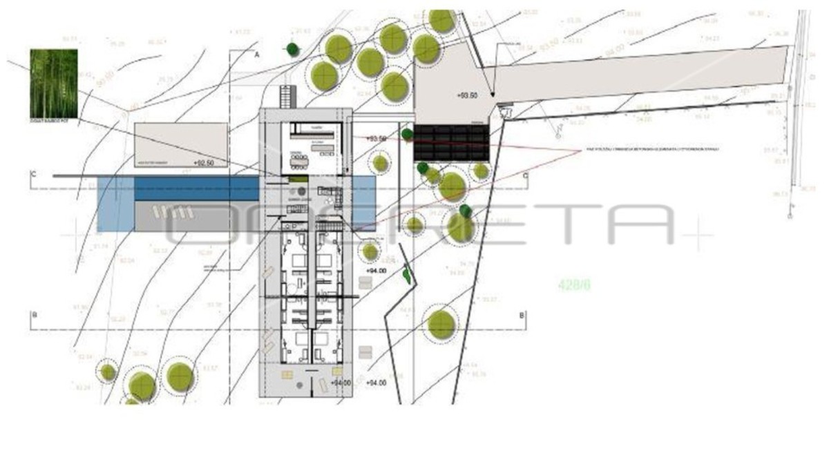 Zemljišče, sestavljeno iz 3 parcel s skupno površino 22.586 m2, skupaj z idejno zasnovo za luksuzno hišo, predstavlja odličen investicijski potencial v Istri. Idejna zasnova predstavlja luksuzno hišo, ki se nahaja na severni strani naselja v mirnem okolju, obdana z oljčnimi nasadi, hrastovim gozdom in odprtim pogledom na zahod. Po idejnem projektu je skupna površina pokritih prostorov hiše 648 m2, skupna notranja površina pa 586 m2 GBP.