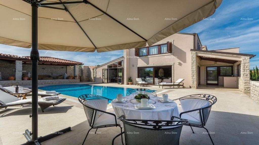 Kamenim stepenicama se prilazi kući i na grijani bazen koji je površine 50 m2, pored bazena se nalazi zidani kamin, zatim, vanjski prostor za druženje u produžetku je sauna.