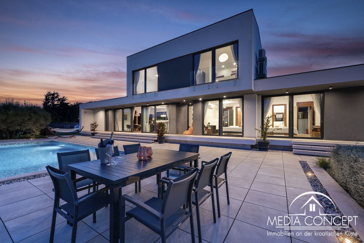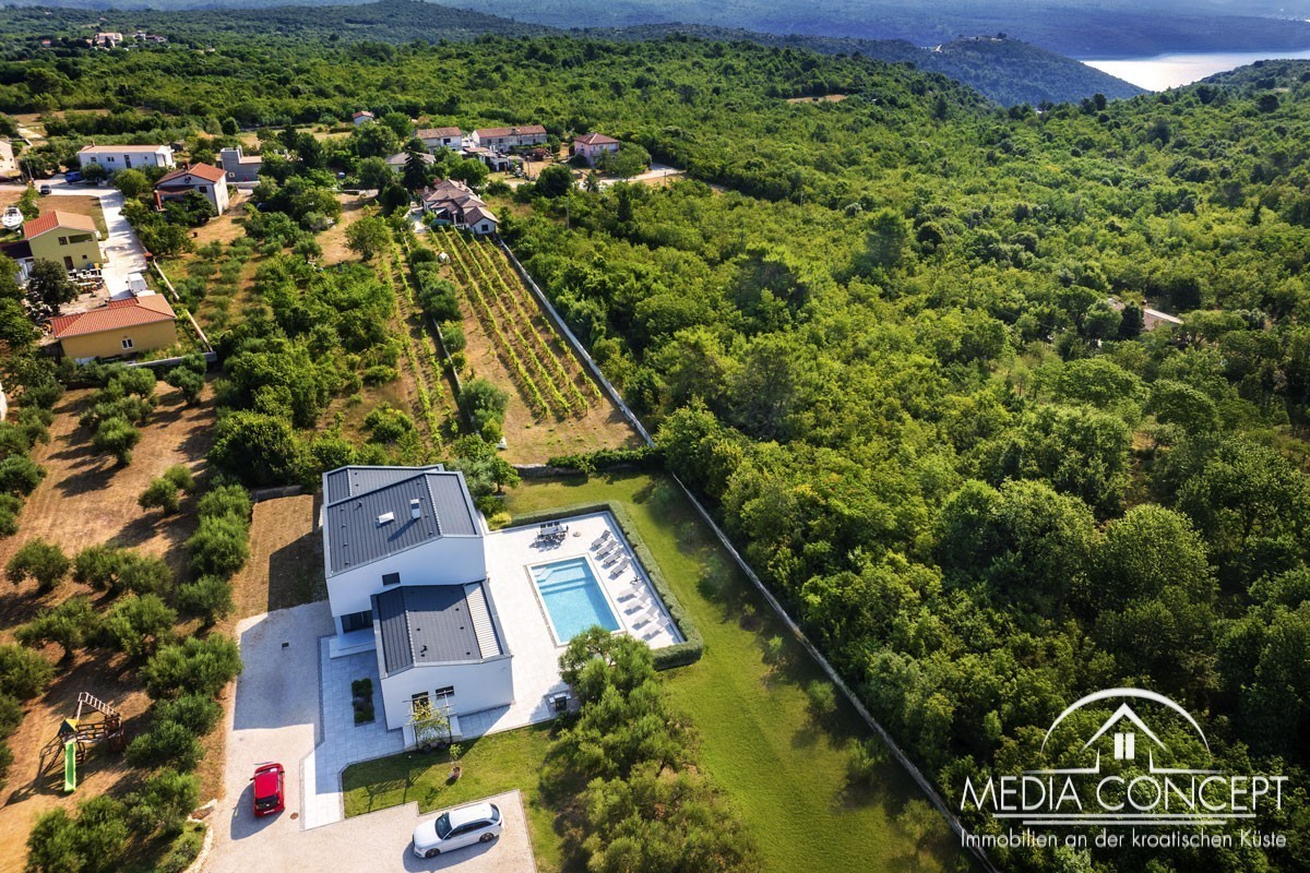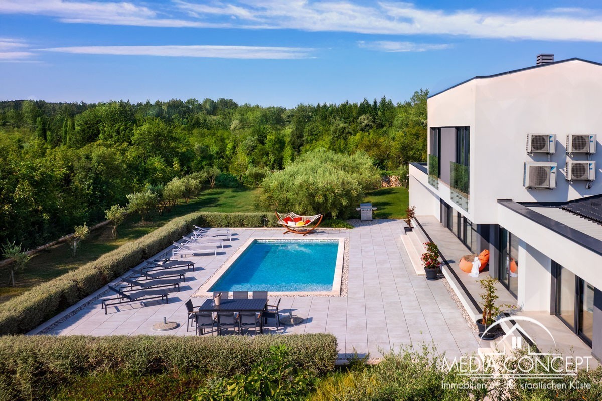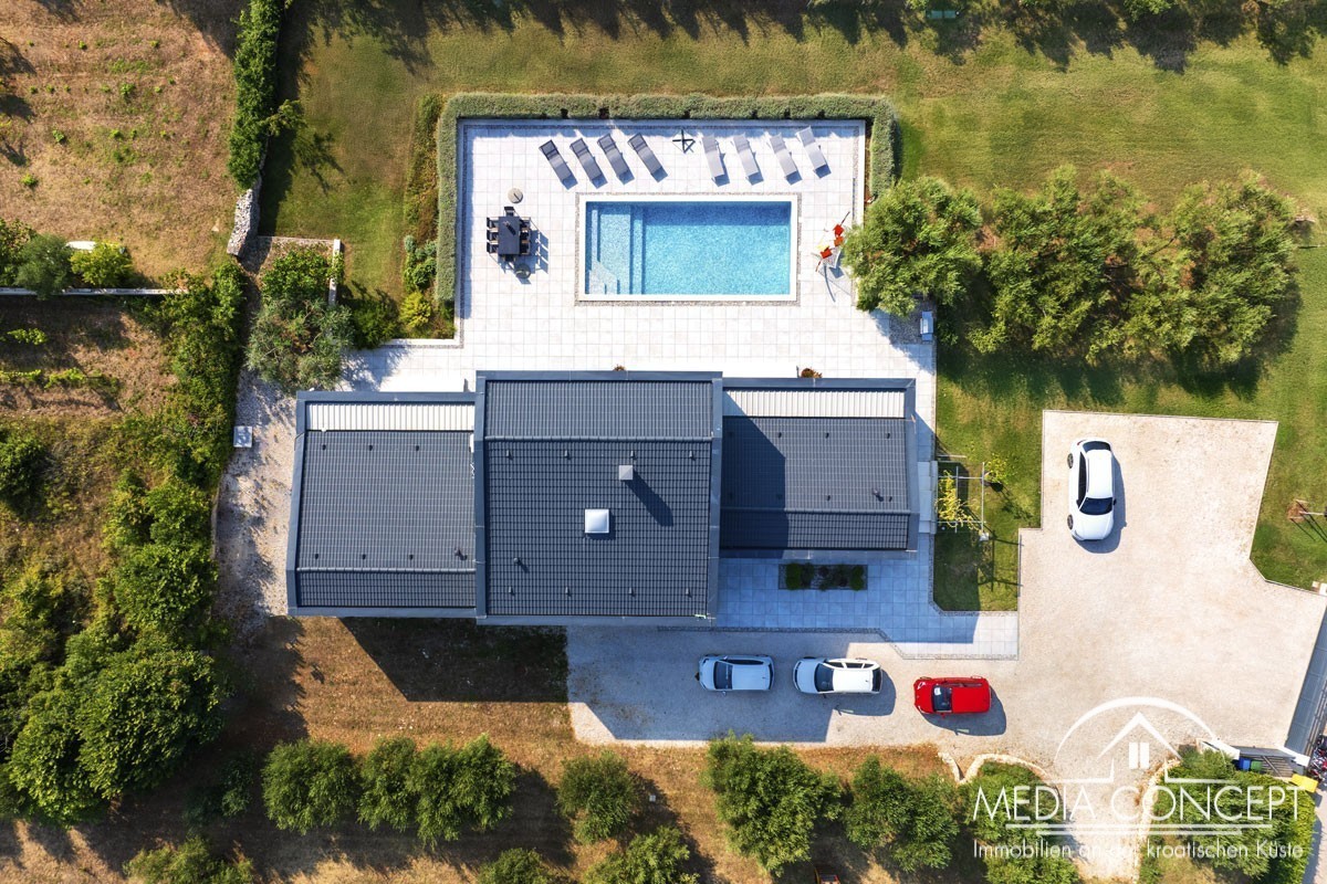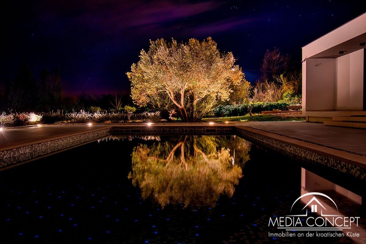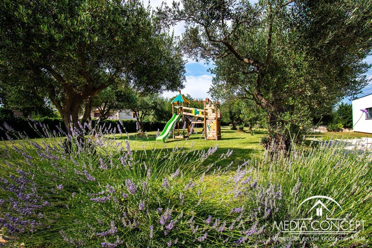 Vila na velikom zemljištu od 4.000 m². Na okučnici je posađeno trideset maslina. Ispred kuće se nalazi bazen velićine 50 m2. Vila se nalazi na mirnom dijelu naselja nedaleko mora. Vila je kompletno namještena. Potpuno opremljena kuhinja i blagovaonica nalaze se u prizemlju