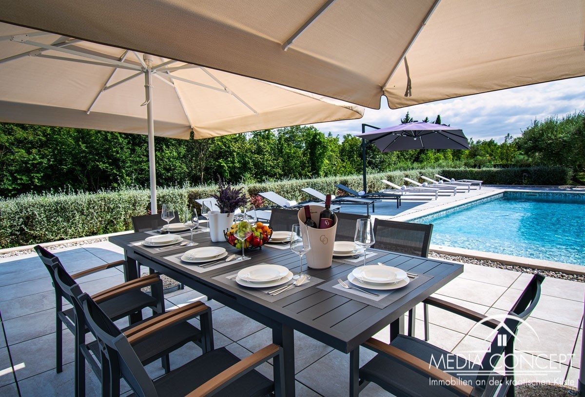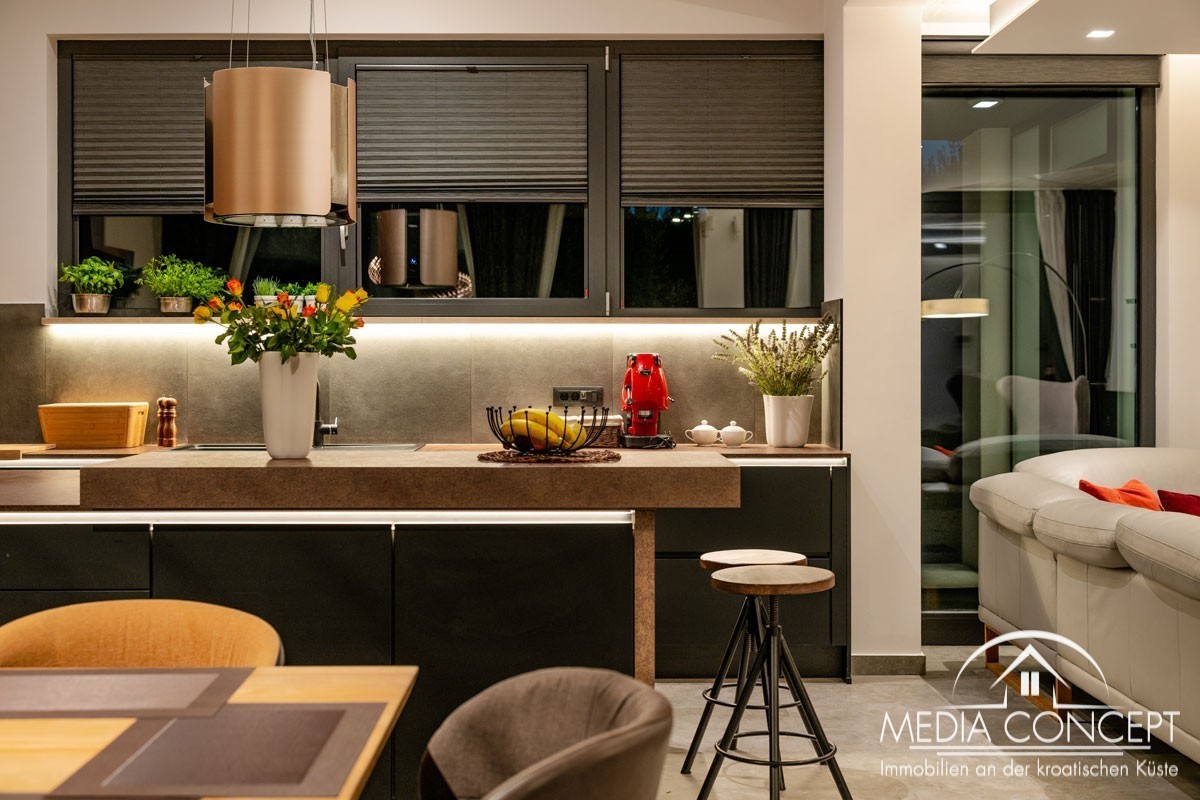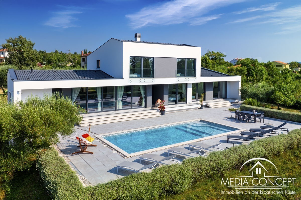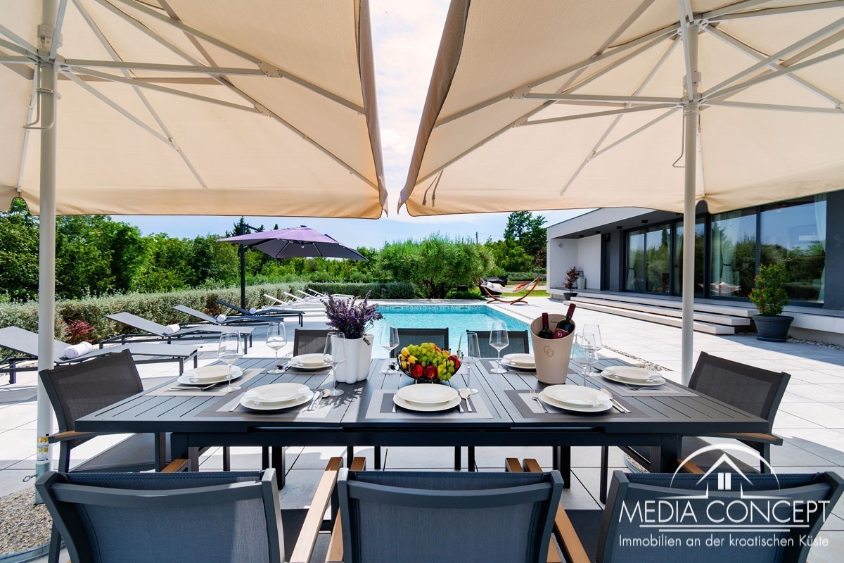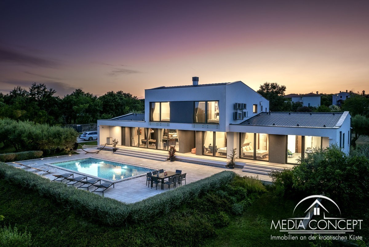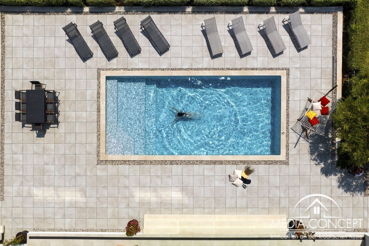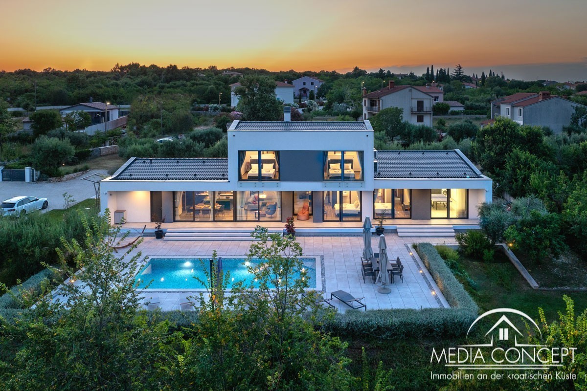 Vila na velikom zemljištu od 4.000 m². Na okučnici je posađeno trideset maslina. Ispred kuće se nalazi bazen velićine 50 m2. Vila se nalazi na mirnom dijelu naselja nedaleko mora. Vila je kompletno namještena. Potpuno opremljena kuhinja i blagovaonica nalaze se u prizemlju