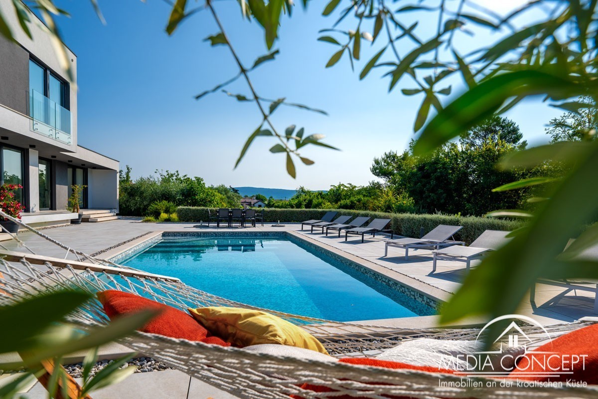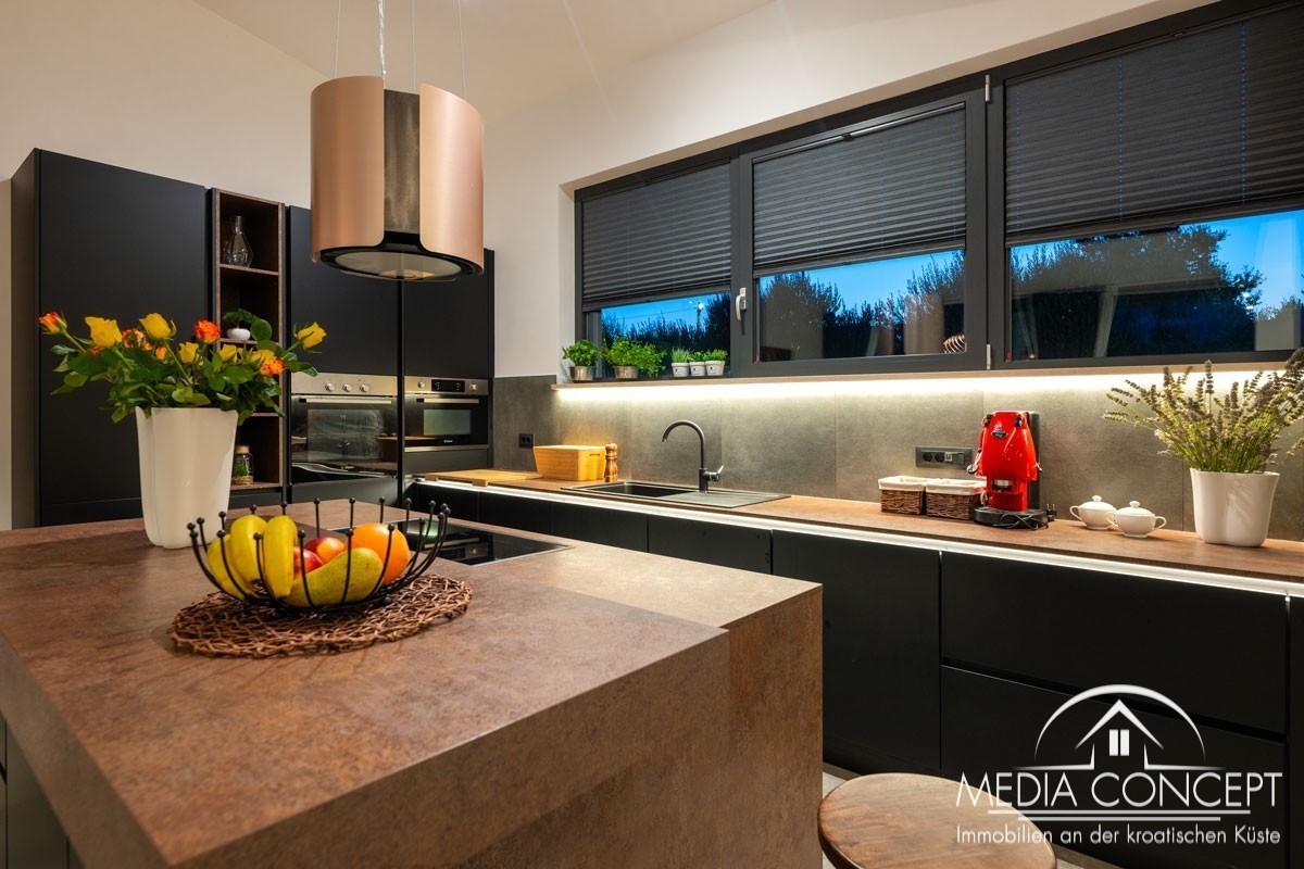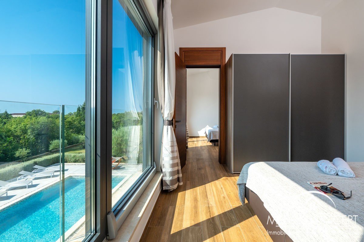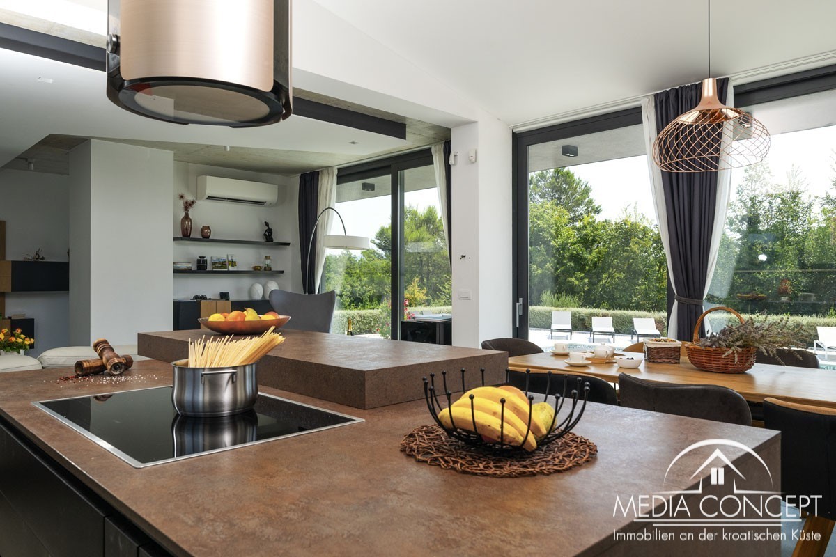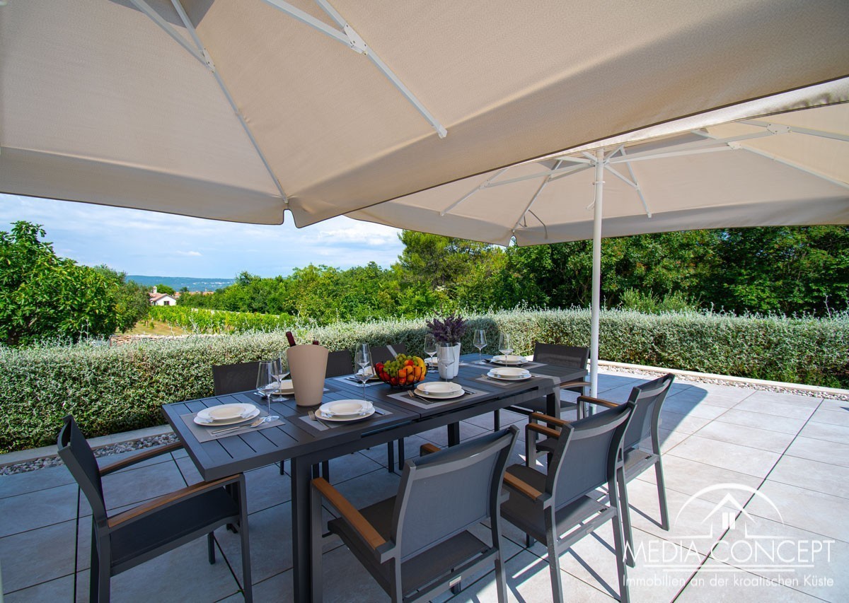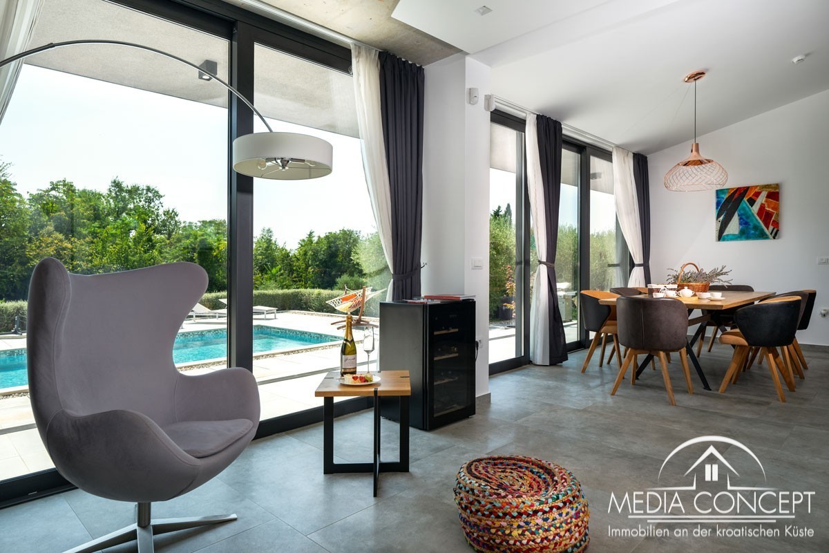 Vila na velikom zemljištu od 4.000 m². Na okučnici je posađeno trideset maslina. Ispred kuće se nalazi bazen velićine 50 m2. Vila se nalazi na mirnom dijelu naselja nedaleko mora. Vila je kompletno namještena. Potpuno opremljena kuhinja i blagovaonica nalaze se u prizemlju
