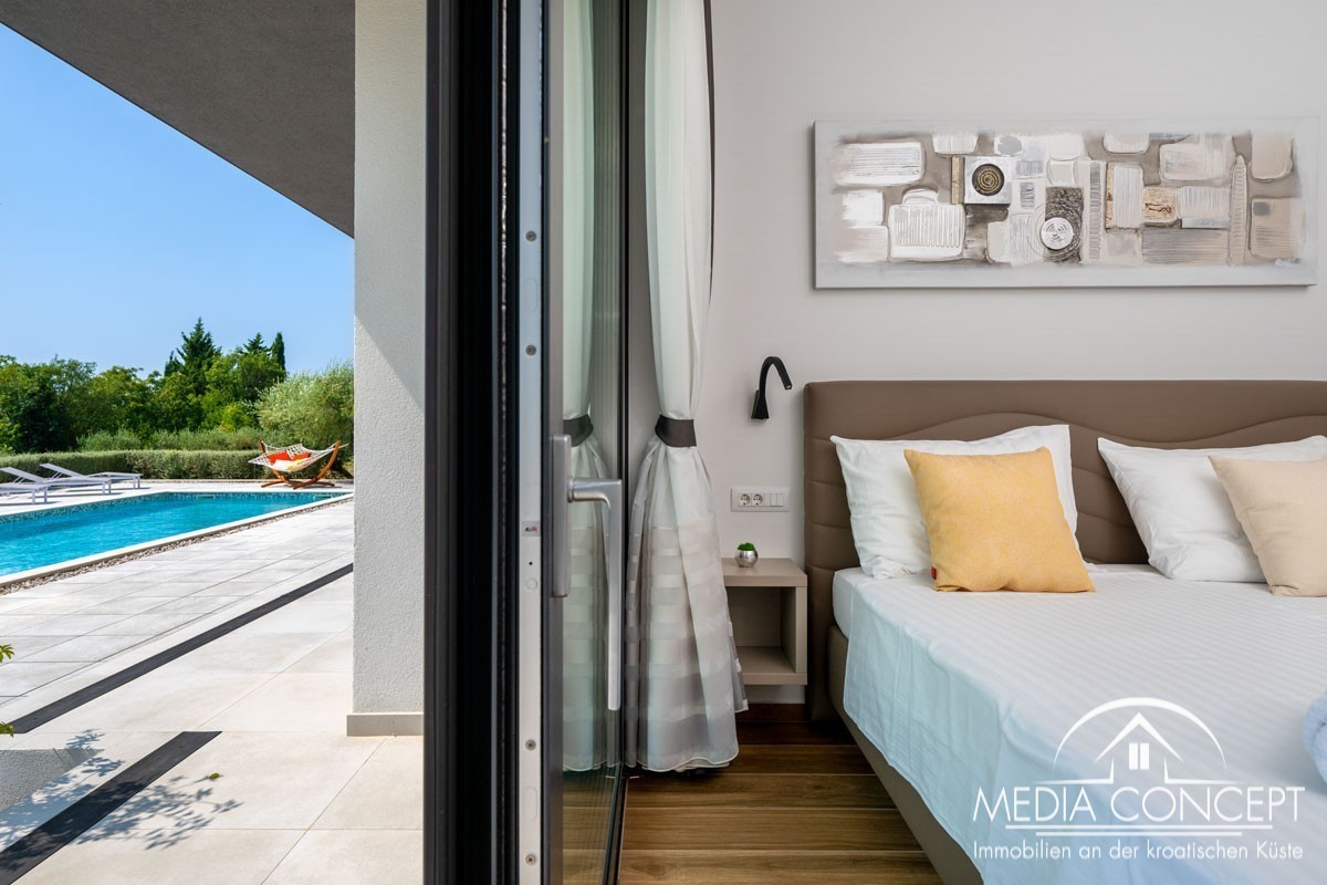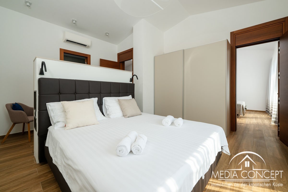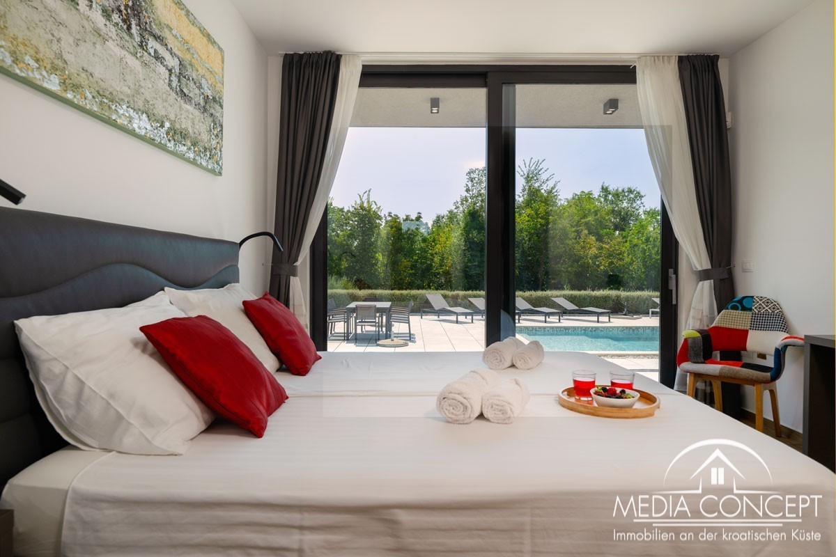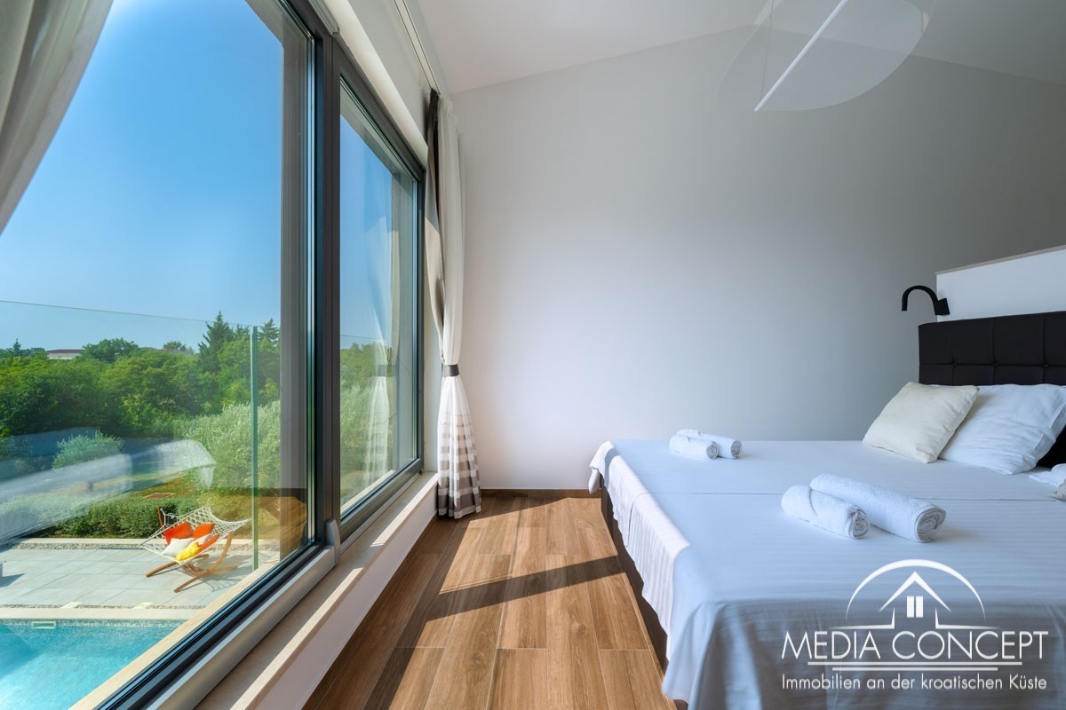 U prizemlju se osim toga nalaze 2 spavaće sobe s vlastitim kupaonicama. Svaka spavaća soba ima pristup i prekrasan pogled kroz stakleni zid na bazen.