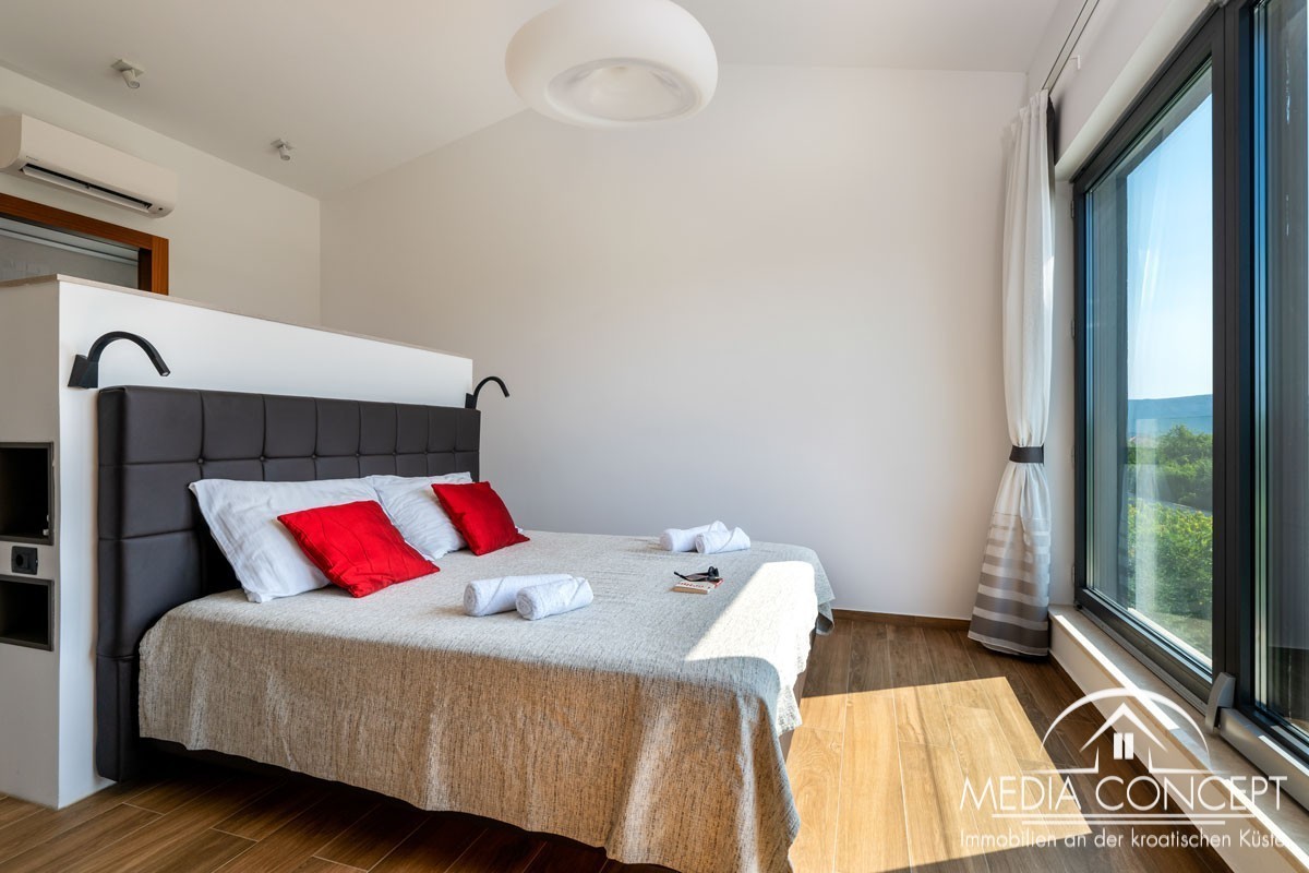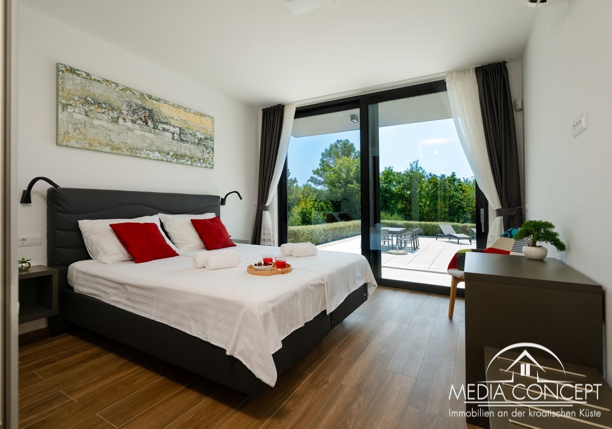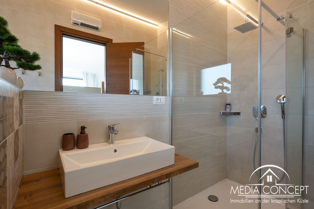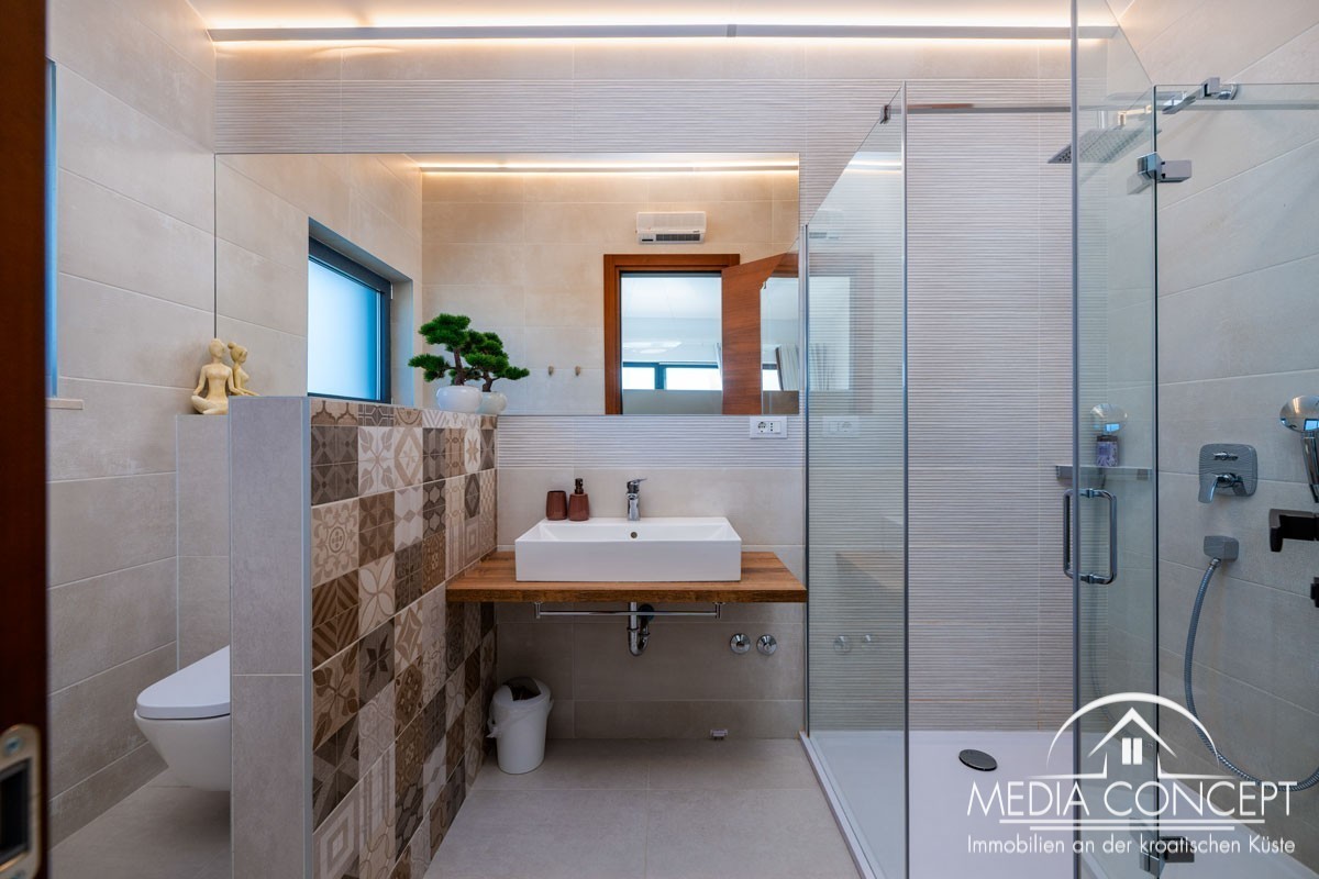U prizemlju se osim toga nalaze 2 spavaće sobe s vlastitim kupaonicama. Svaka spavaća soba ima pristup i prekrasan pogled kroz stakleni zid na bazen.