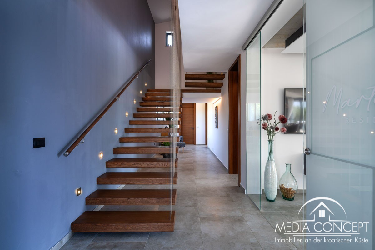 Elegantne masivne drvene stepenice vode na prvi kat koji započinje galerijom. Dalje na prvom katu se nalaze 2 spavaće sobe s vlastitim kupaonicama.