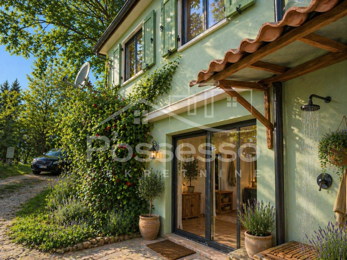 SAMO U PONUDI NAŠE AGENCIJE – LUPOGLAV - OBITELJSKA KUĆA S APARTMANOM I OKUĆNICOM Na prodaju je obiteljska kuća ukupne stambene površine 90 m², smještena na nekoliko minuta udaljenosti od Lupoglava, raspoređena na dvije etaže. U prizemlju se nalazi zaseban, namješten apartman, pogodan za turistički najam ili smještaj gostiju. Na prvom katu smješten je stan koji se sastoji od: velikog ostakljenog hodnika dnevnog boravka kuhinje spavaće sobe kupaonice dodatnog hodnika s izlazom na stražnji dio vrta Okućnica iznosi cca 609 m² te postoji mogućnost dodatnog uređenja vanjskog prostora, uključujući i izgradnju bazena. Kuća se prodaje djelomično namještena, dok je apartman u prizemlju u potpunosti opremljen. Grijanje je putem klima uređaja i peći na drva. Nekretnina je pogodna za obiteljski život, kao i za investiciju s potencijalom turističkog najma. Napomena: Uz stvarne fotografije nekretnine, u oglasu su prikazane i vizualizacije izrađene pomoću umjetne inteligencije. Iste služe isključivo kao ilustracija potencijala prostora i lakšeg sagledavanja mogućnosti uređenja. Za više informacija i rezervaciju termina razgledavanja nekretnine kontaktirajte nas: Direktna poruka na w-app: https://wa.me/385989612720?text=Upit%20s%20weba Poziv: 098 961 2720