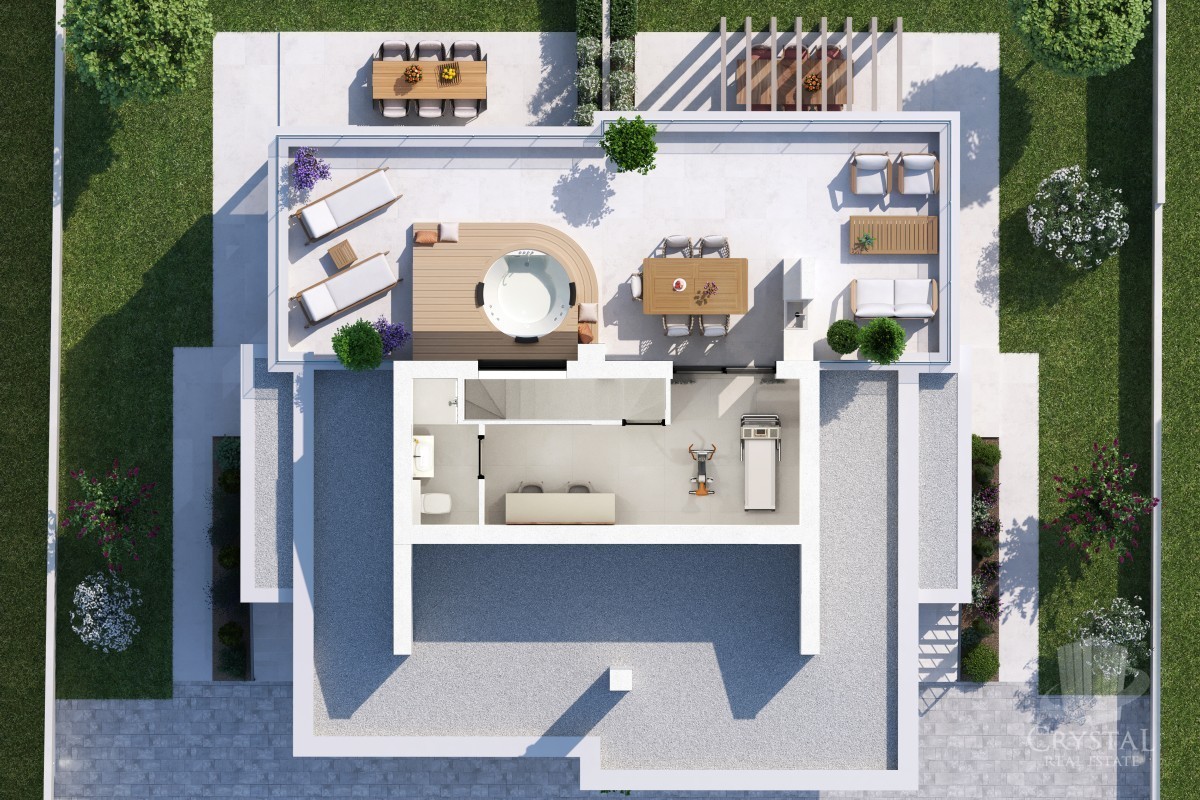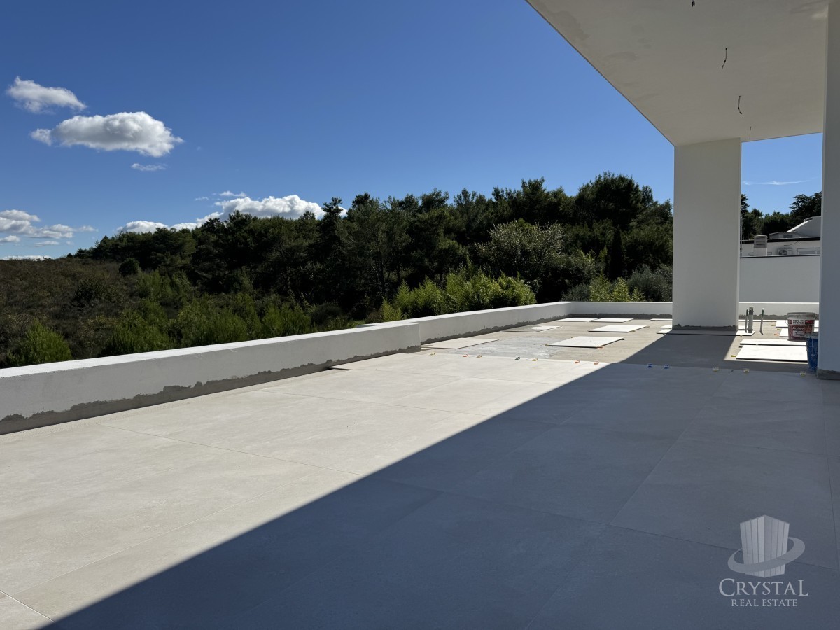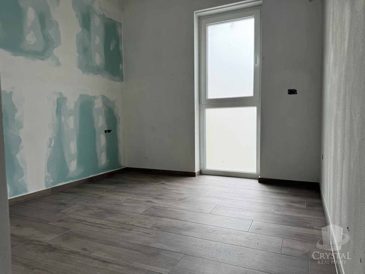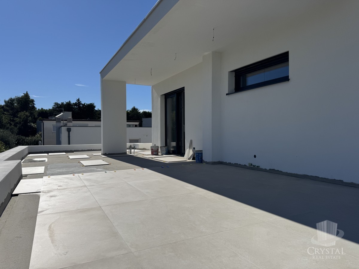 Stan se sastoji od 2 spavaće sobe, 1 radne sobe i 2 kupaonice, što ga čini idealnim za obitelji ili one koji rade od kuće. Prostrana terasa od 55 m² s staklenom ogradom nudi prekrasan pogled na more, a od toga je 20 m² natkriveno, gdje je predviđena ljetna kuhinja – savršeno mjesto za uživanje u sunčanim danima.