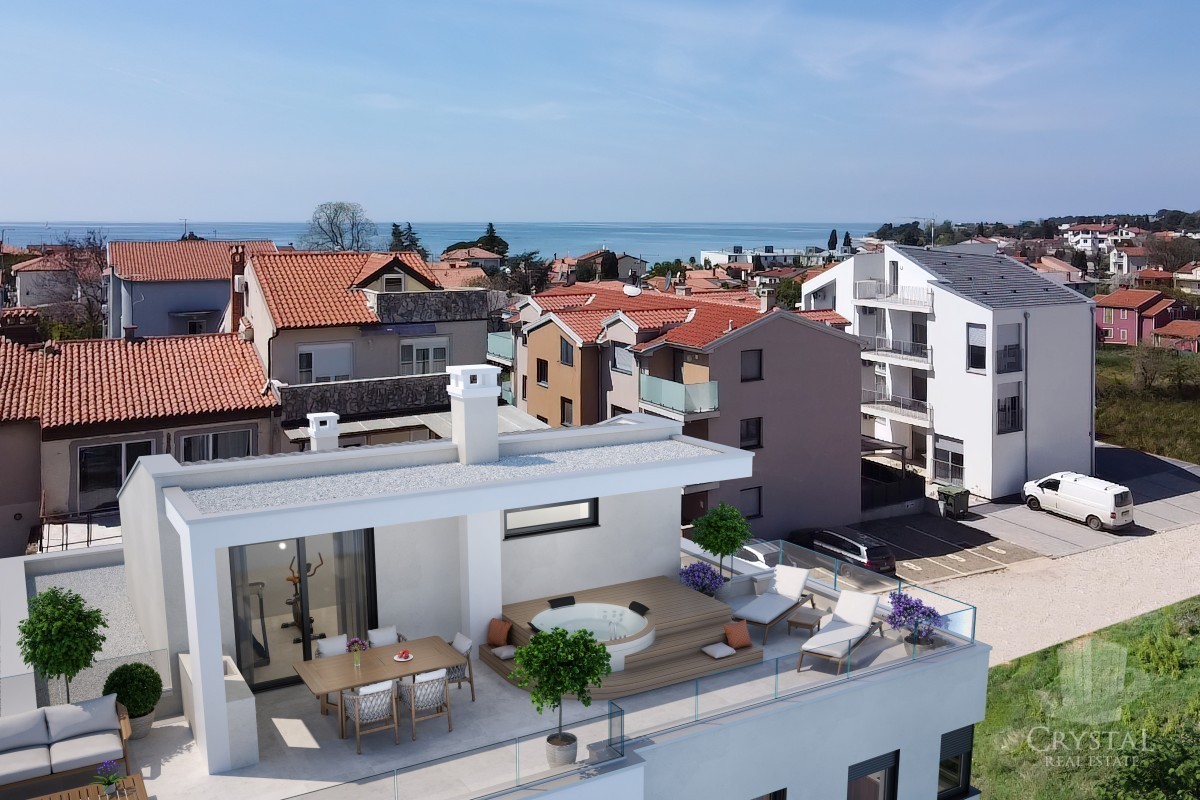 Na prodaju je prostrano i moderno dvoetažno stanovanje s neto površinom od 101 m² (bruto 140 m²), smješteno u okolici Umaga, udaljeno oko 300 m od mora i plaže.