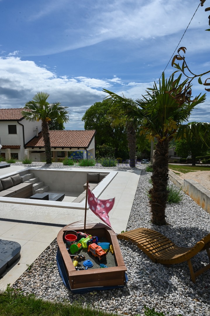 Centralni dio uređenog i ograđenog dvorišta dvorišta zauzima bazen sa sunčalištem i prostorom za odmor,opremljen fitness kutak te sadržaji za djecu.