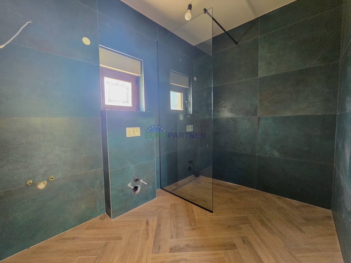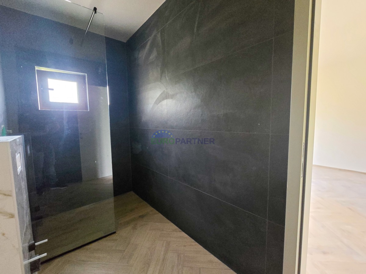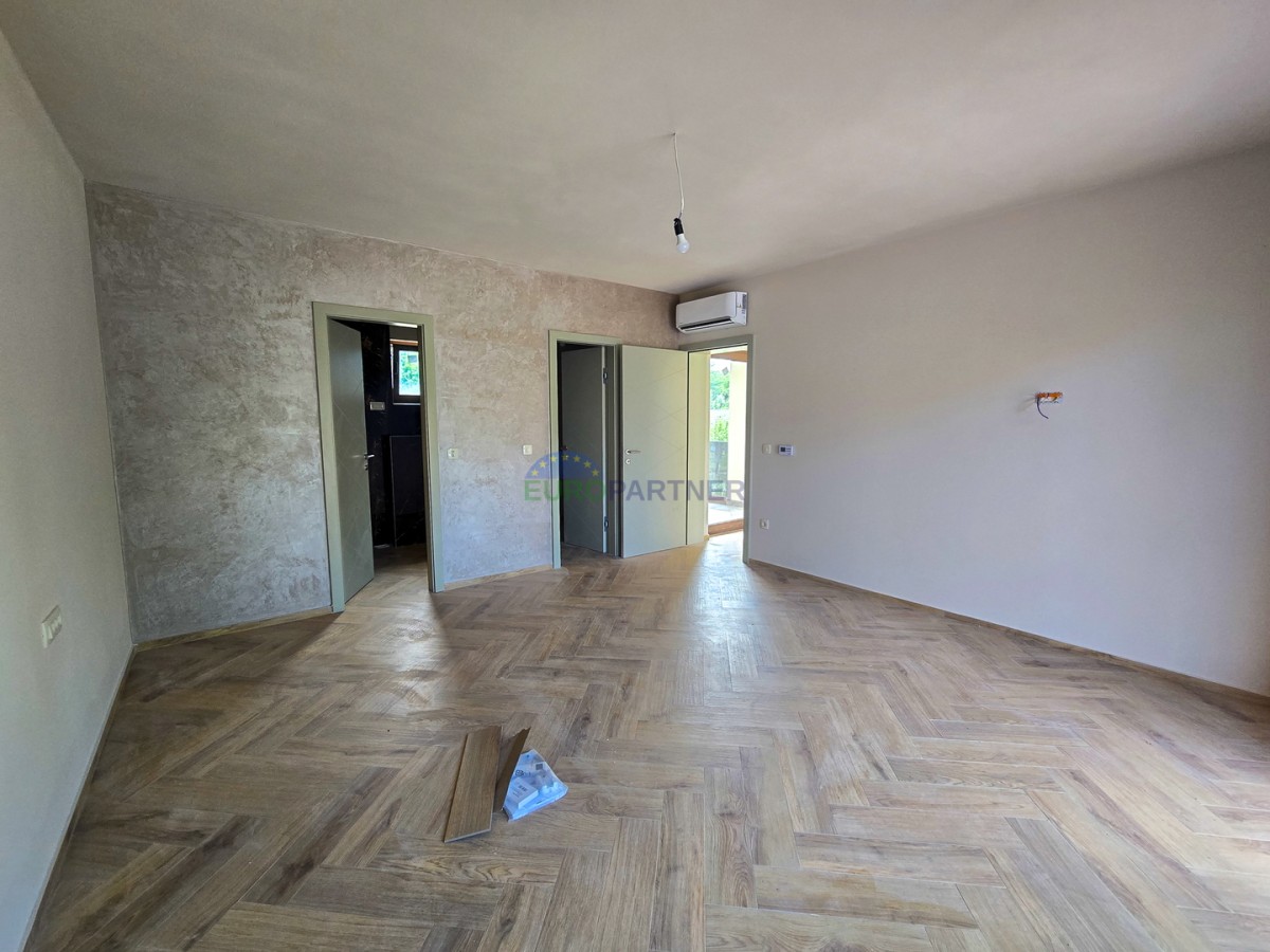 Prizemlje se sastoji od dnevnog boravka, kuhinje i blagovaonice, ulaznog hodnika, wc-a, tehničke sobe, natkrivene terase, spavaće sobe s vlastitom kupaonicom i wellnessa (jacuzzi + sauna).