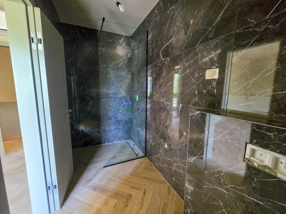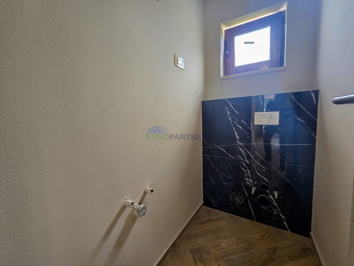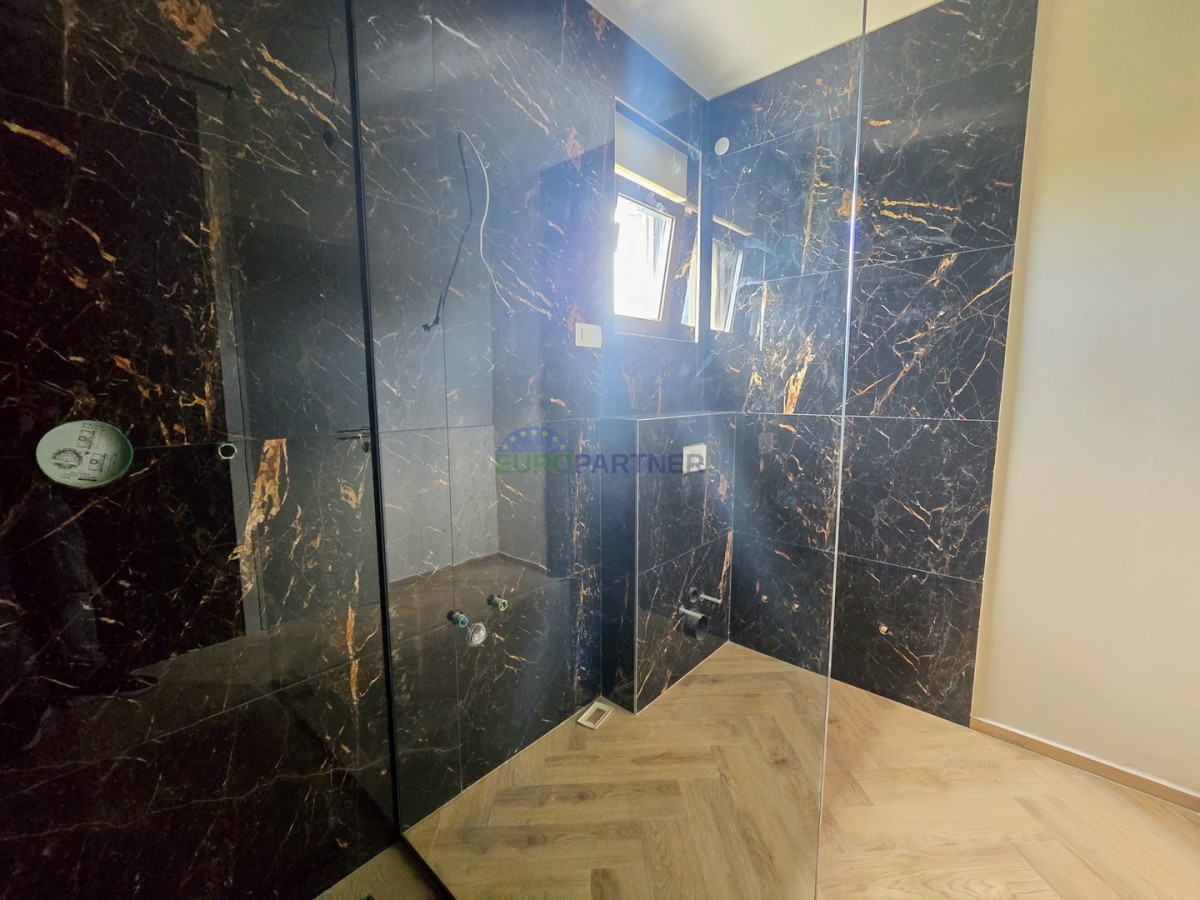 Prizemlje se sastoji od dnevnog boravka, kuhinje i blagovaonice, ulaznog hodnika, wc-a, tehničke sobe, natkrivene terase, spavaće sobe s vlastitom kupaonicom i wellnessa (jacuzzi + sauna).