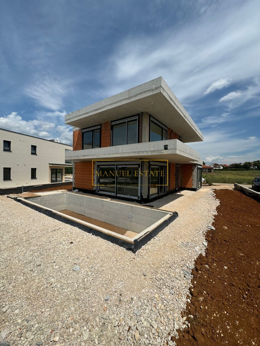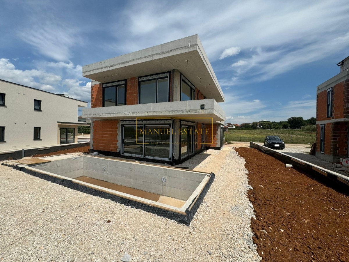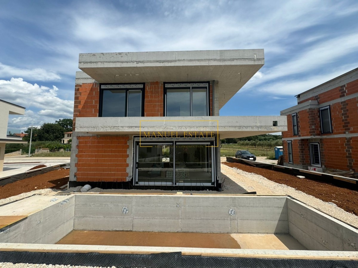 Moderna vila u blizini Poreča, 233 m2, na parceli od 571 m2. U prizemlju se nalazi spremište, wc, tehnička prostorija, wellness zona i open space dnevni boravak s kuhinjom i blagovaonicom s izlazom na natkrivenu terasu. Na prvom katu biti će smještene tri spavaće sobe, svaka sa vlastitom kupaonicom i natkrivena terasa. U potkrovlju će biti 2 spremišta, kupaonica, prostorija za saunu sa prvom fazom i velika natkrivena terasa od 78 m2 sa pogledom na more. Podno grijanje, toplinska pumpa, klima uređaji. Kamin. Bazen sa sunčalištem. Parking. Vila se nalazi na oko 4 km od centra grada i mora.