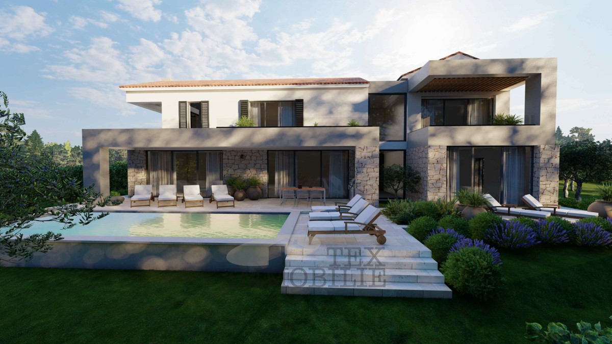 Predstavljamo izvanrednu modernu vilu, smještenu na čarobnoj lokaciji koja se ponosi svim potrebnim sadržajima, udaljena samo 12 kilometara od Poreča i svega 8 kilometara od mora. Ova izvanredna vila obuhvaća ukupnu neto površinu, uključujući terase, koja iznosi 249,50 četvornih metara, smještena na prostranom zemljištu od 1026 m2.