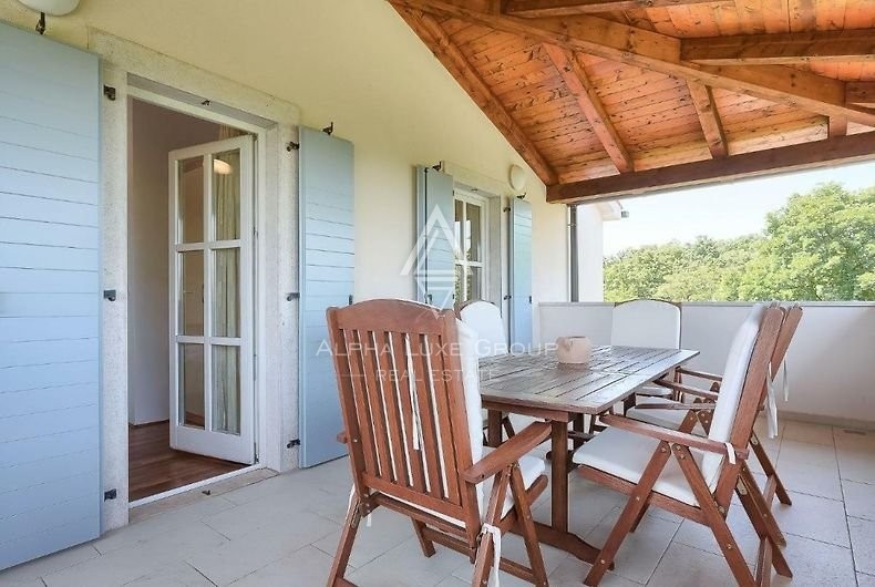 Prizemlje se otvara prema dobrodošlom hodniku, koji vodi do stilskog dnevnog boravka, te dobro opremljene kuhinje i blagovaonice. Vila je klimatizirana i ima plinsko centralno grijanje, osiguravajući udobnost tijekom cijele godine. Ekološki prihvatljive značajke uključuju solarne panele za grijanje sanitarne vode. Nekretnina je ukrašena suvremenim namještajem i nudi se potpuno namještena.