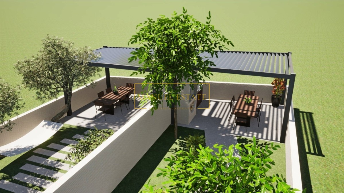 Prodaje se novogradnja sa dvije stambene jedinice. Radi se o dva identična stana, ukupne stambene površine od 126,40 m2 po stanu; svaki stan prostire se na tri etaže. U prizemlju se nalazi prostrani dnevni boravak, kuhinja sa blagovaonicom, i spremište. Na prvom katu smještene su dvije spavaće sobe i kupaonica, dok je u potkrovlju kuće smještena još jedna spavaća soba sa kupaonicom i terasom s pogledom na prirodu koja okružuje kuću. Iz dnevnog boravka kroz staklene stijene pruža se pogled na zelenilom uređeni vrt, te se iz dnevnog boravka izlazi na natkrivenu terasu. Klima uređaji postavljeni su u svakoj sobi, a grijanje je podno na sve tri etaže. U dvorištu kuće nalazi se i ljetna kuhinja sa roštiljem. Dva parkirna mjesta. Cijena jedne stambene jedinice je 340.000 eura, a cijela kuća je 680.000 eura. Za sve ostale informacije molimo da nam se obratite.