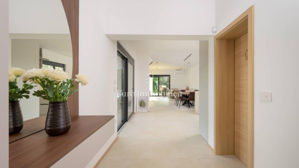 Vila se pruža na 140m2 unutarnjeg prostora te se sastoji od hodnika,tri spavaće sobe, dva kupatila, open space kuhinje sa blagovaonicom te dnevnim boravkom. Iz dnevnog boravka se izlazi na veliku terasu opremljenu roštiljem i ljetnom blagovaonom te na bazen veličine 31m2.