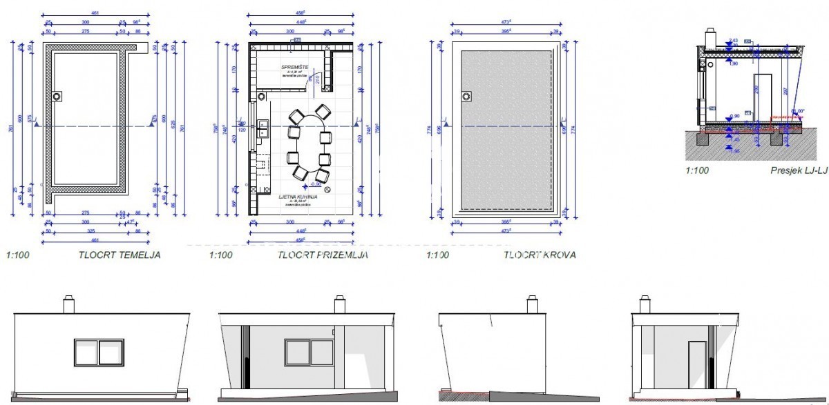 Kuća će biti podijeljena na 2 etaže. Po izlasku iz automobila dolazi se na natkriveni prolaz do ulaznih vrata. Ulaskom u vilu nalazimo hodnik koji povezuje spavaću sobu s pratećom kupaonicom, jedan gostinjski wc, te otvoreni prostor koji se sastoji od kuhinje blagovaonice i prostranog dnevnog boravka. Iz blagovaonice/dnevnog boravka će biti izlaz na djelomično natkrivenu terasu.