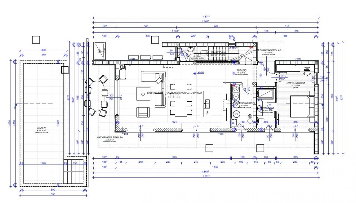 U dvorištu koje će biti ograđeno smjestit će se bazen površine od 36m2 sa sunčalištem te ljetna kuhinja i spremište. Svakako je važno spomenuti kako će i zeleni pojas oko kuće biti uređen mediteranskim biljem i opremljen sustavom automatskog navodnjavanja.