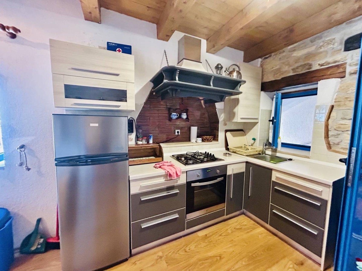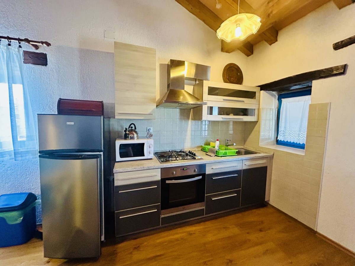 Unutrašnjost kuće raspolaže s tri spavaće sobe i orijentacijom prema jugozapadu, omogućujući obilje prirodnog svjetla i topline tijekom cijelog dana. Prostor je opremljen funkcionalnom kuhinjom s aparatima, perilicom posuđa, perilicom rublja, televizorom, krevetom i radnim stolom, što zadovoljava potrebe suvremenog života.