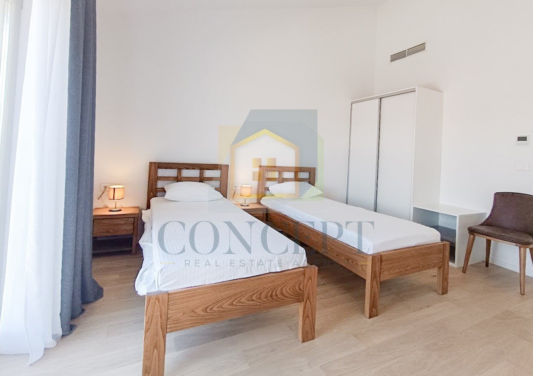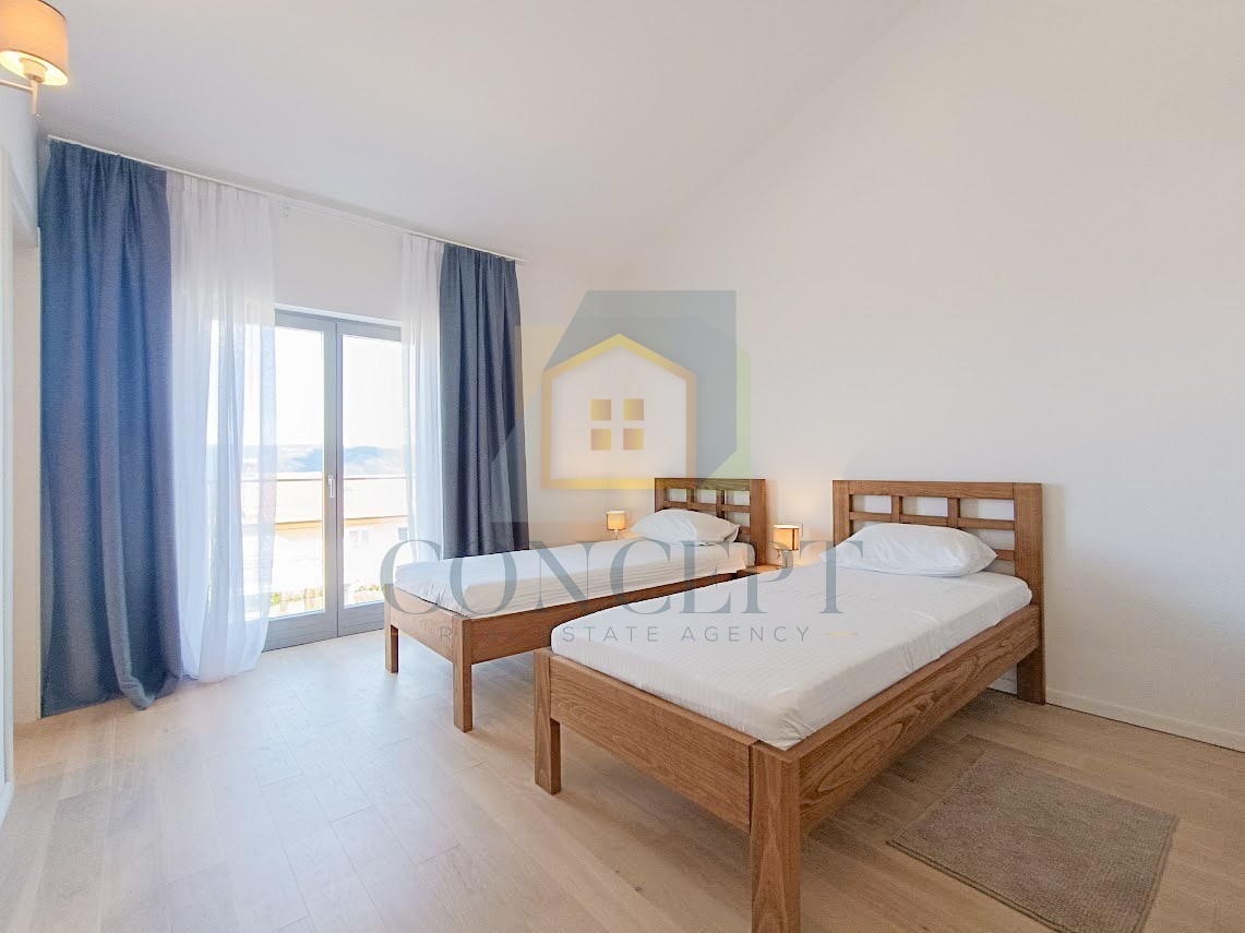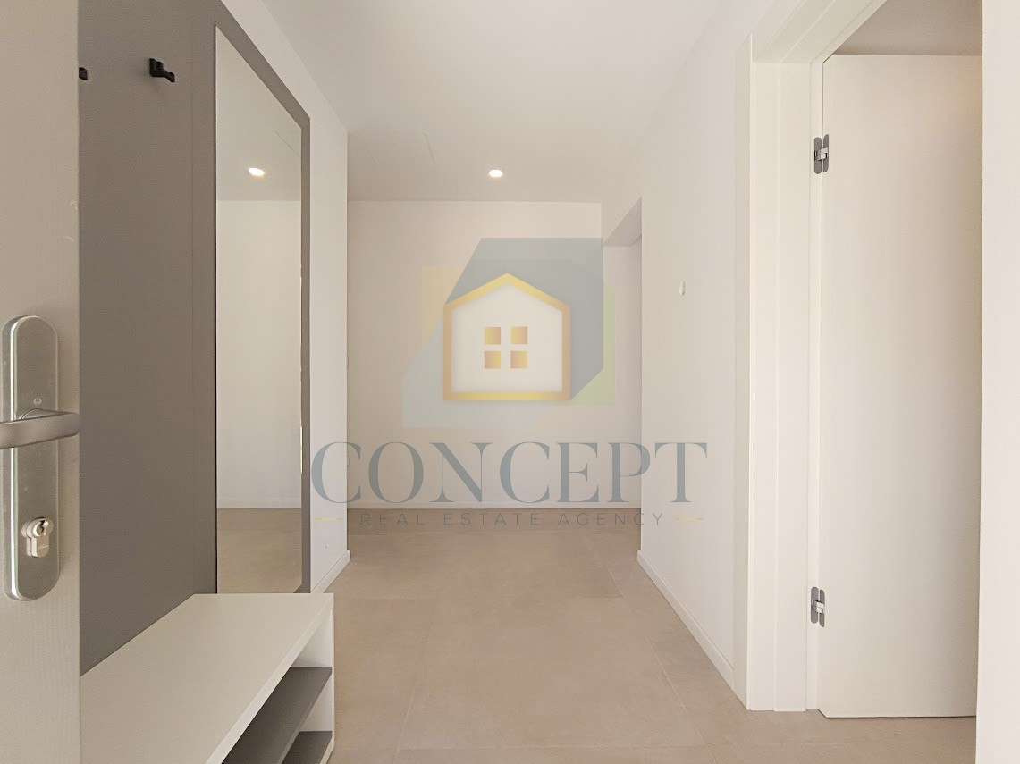 Sastoji se od ulaznog hodnika, toaleta s vešerajem, dnevnog dijela koji uključuje kuhinju, blagovaonicu i dnevni boravak u otvorenom konceptu, te dvije prostrane spavaće sobe s vlastitim kupaonicama.