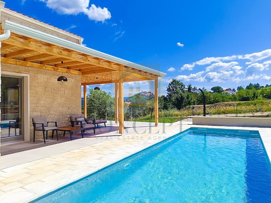 U okolici Motovuna prodaje se novoizgrađena kuća s očaravajućim pogledom na brežuljkasti krajolik i stari grad Motovun. Kuća se nalazi na mirnoj lokaciji, udaljena otprilike 3 km od centra Motovuna i oko 26 km od mora.